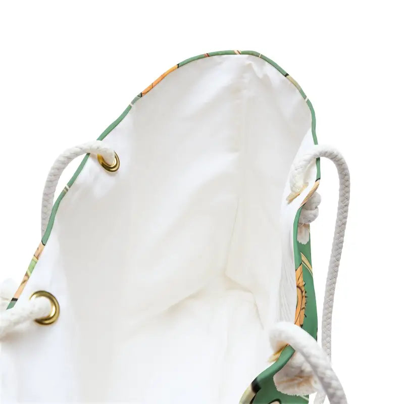 A sea of chartreuse and leafy greens twirls across a creamy backdrop, creating a green weekender bag that instantly lifts your spirits. The broad rectangular shape holds everything from beach towels to laptops, while twisted rope handles add a coastal-chic vibe you’ll love to show off.