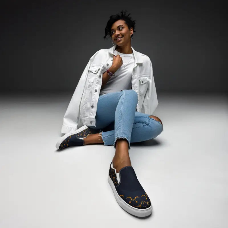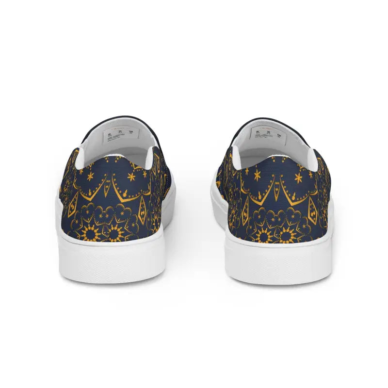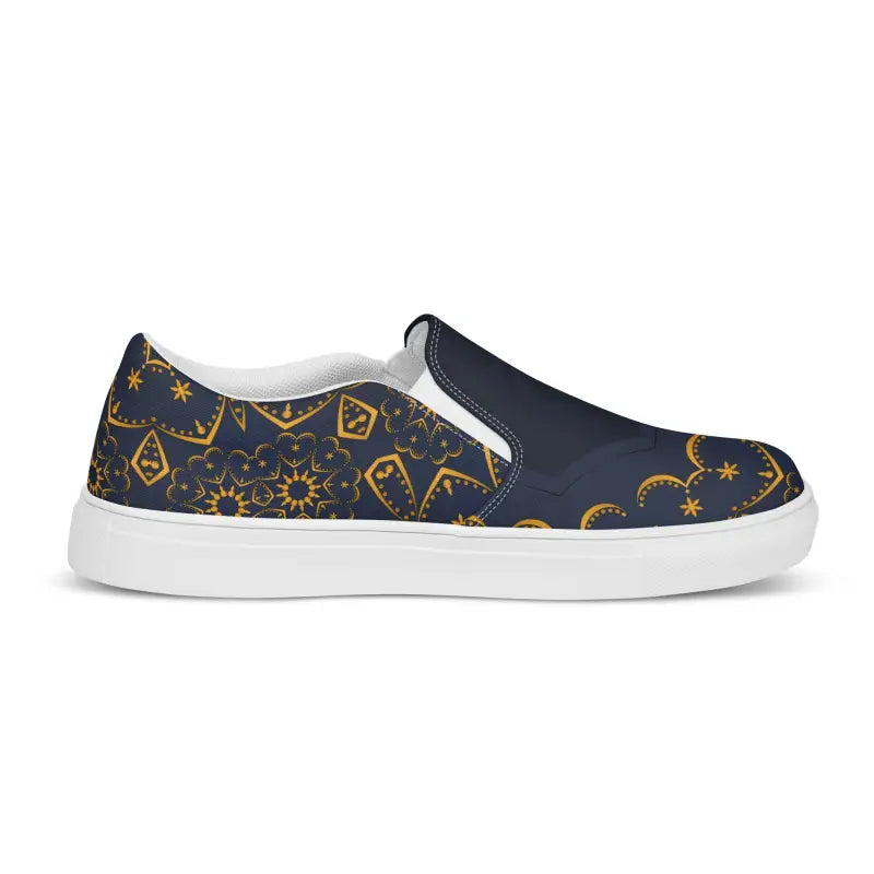 Elevate your style and make every step count with these glamorous canvas shoes. Embrace the magic of these women's slip designs and let the captivating mix of a gold pattern with the versatility of navy canvas shoes redefine your wardrobe today.