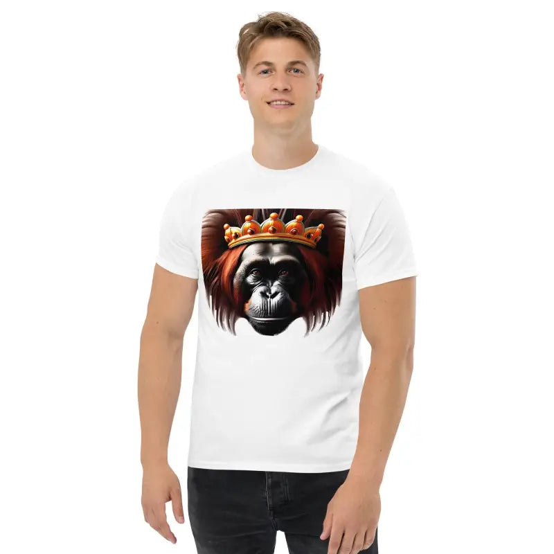 Ready to stand out and ignite your style with a bold new look that speaks volumes of confidence? This dapper men's classic tee featuring a head-turning gorilla with a crown print is your secret weapon for a wardrobe that never goes unnoticed.