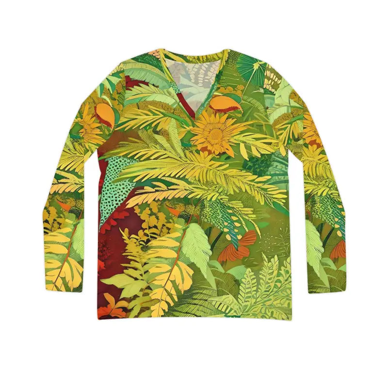 Print: Limited Edition Leafy Chic Brown Leaves pattern elegantly gracing the long sleeves and sleeve v neck style of this standout womens’ v-neck tee.