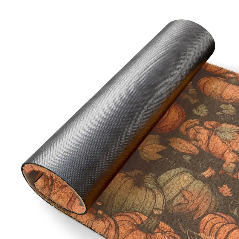Halloween pumpkins and autumn leaves, Doormat. Meet the perfect welcoming doormat with beautiful prints. Each mat comes in a 24" x 16" size and is made with Grade A tufted coir coconut fiber, making it perfect for outdoor use. All mats feature black vinyl backing for increased stability.