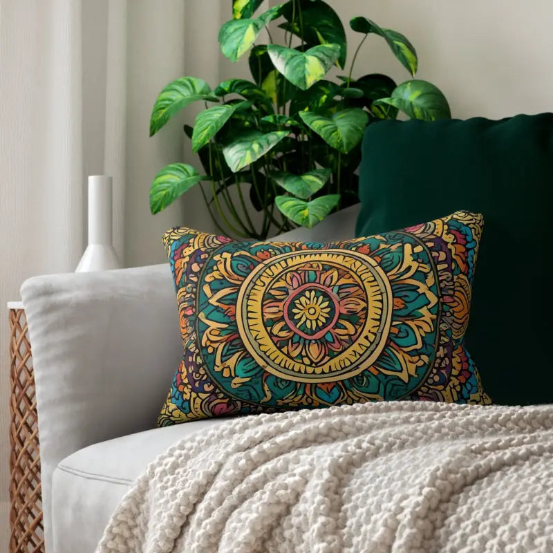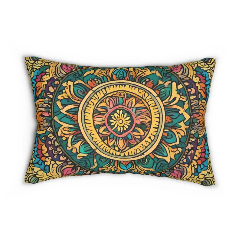 Indian colorful pattern, Spun Polyester Lumbar Pillow. Add this beautiful spun-polyester lumbar pillow to your home decor pieces today. It comes with a stuffing pillow included. The casing is made of a spun polyester fabric that is inherently mildew and water-resistant. You can place your design on both sides or have a different design on each side. It has a hidden beige zipper to maintain a finished and stylish look.