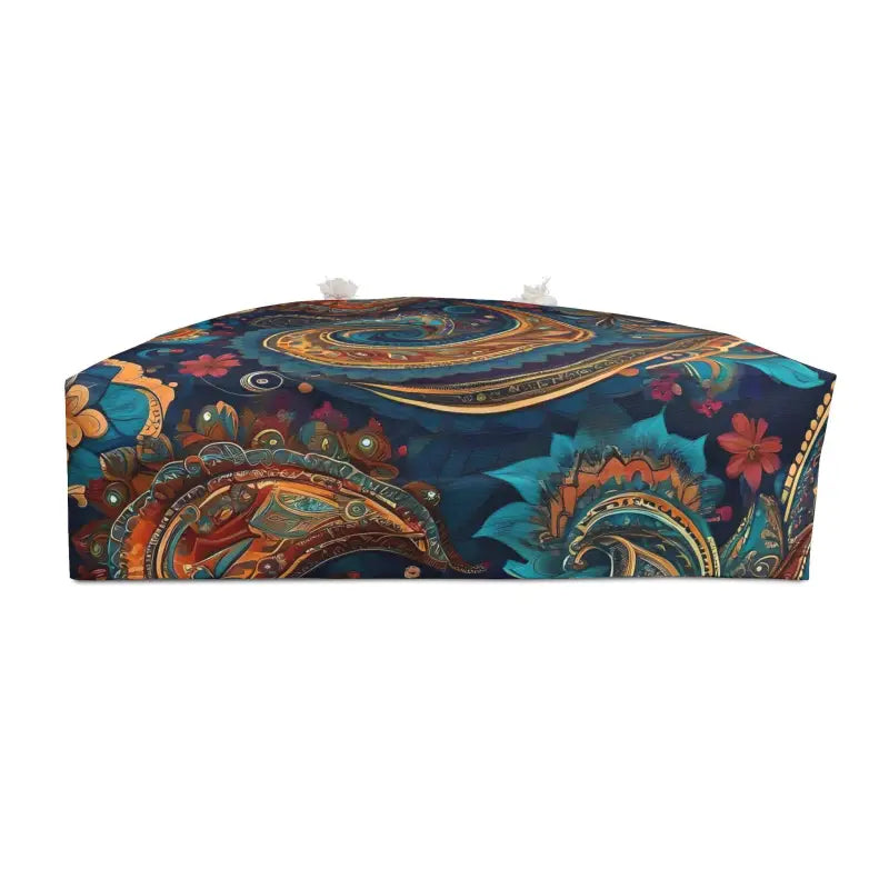 Feel the ocean breeze every time you grab this oversized weekender bag with a vibrant paisley pattern that instantly transports you to sunlit shores. Picture yourself strolling along the boardwalk, toes in sand, as the rich cream and jewel tones dance beneath the sun.