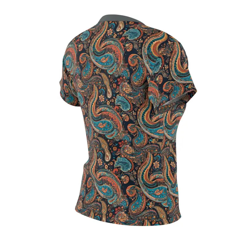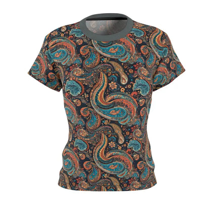 Paisley Pattern, Women's AOP Cut & Sew Tee. Embrace timeless elegance and unmatched comfort with our premium AOP t-shirt. Crafted with utmost care, this classic wardrobe staple captivates from every perspective. Drawing inspiration from the boundless realm of creativity, it empowers you to shine brightly amidst any gathering.