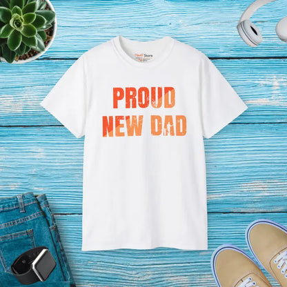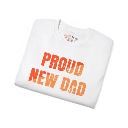 Print: Proud New Dad in bold, modern font splashed across the chest makes a confident statement wherever you go.