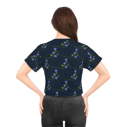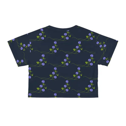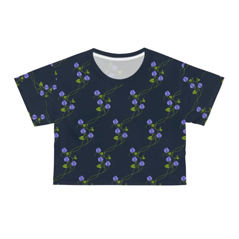 Ready to turn heads and ignite conversations? This Purple Flowers on a Vine on Navy Blue AOP Crop Tee is the missing piece in your fashion puzzle. It's an investment in style, comfort, and quality that you won't want to overlook. Embrace the art of effortless style and add this masterpiece to your collection today!