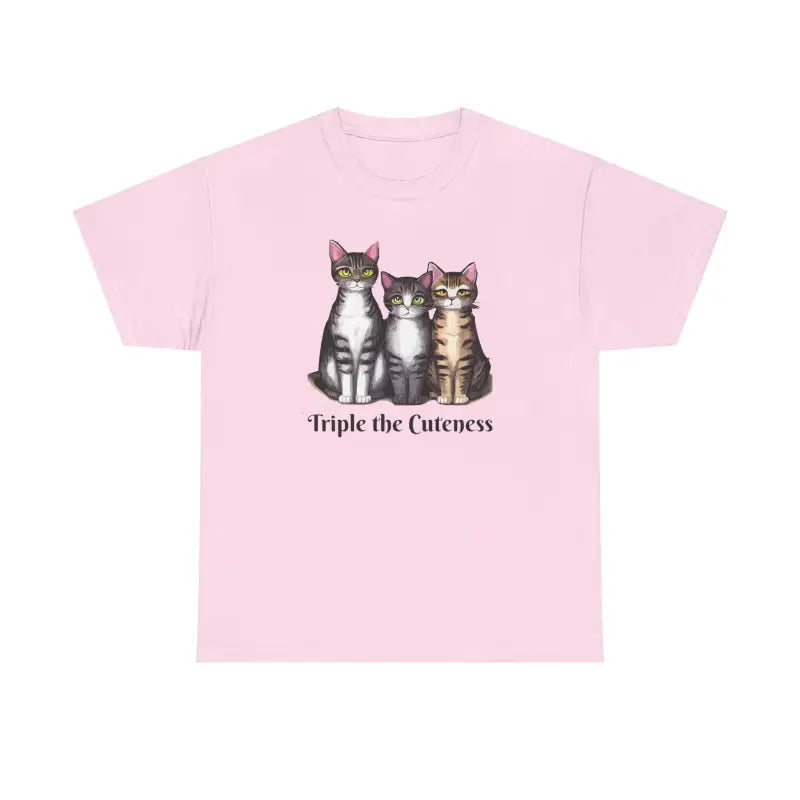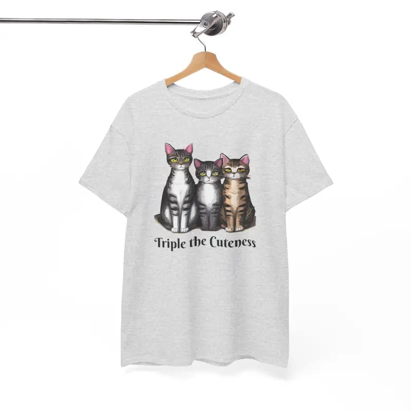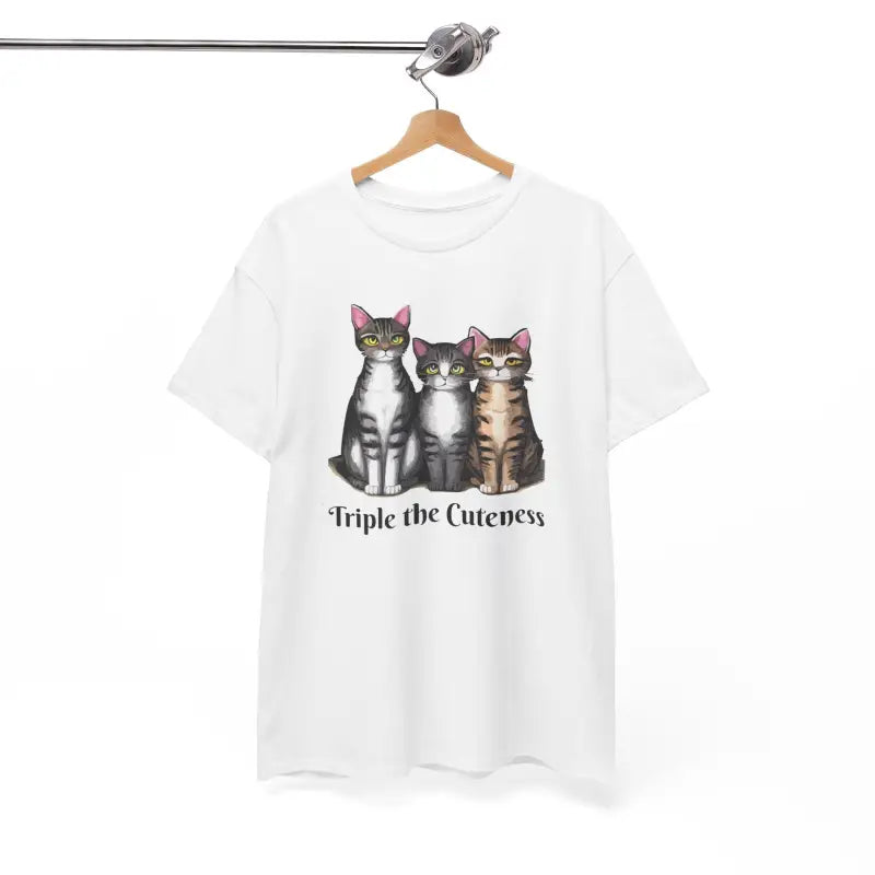 Three Cats, Triple the cuteness, Unisex Heavy Cotton Tee. The unisex heavy cotton tee is the basic staple of any wardrobe. It is the foundation upon which casual fashion grows. The specially spun fibers provide a smooth surface for premium printing vividity and sharpness. No side seams mean there are no itchy interruptions under the arms. The shoulders have tape for improved durability.