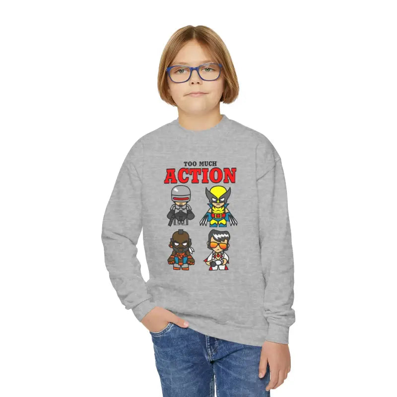 Dive headfirst into the exhilarating world of dynamic fashion with the Too Much Action Youth Crewneck Sweatshirt, crafted with thrill-seekers in mind! This youth crewneck is your ticket to unparalleled comfort and style, combining durability with a dash of fearless flair. Every adventure needs the right gear, and this sweatshirt ensures you're ready for whatever comes your way. Run wild across the schoolyard, conquer the sports field, or chill at the movies with friends—this tee has got your back, offering both warmth and style when you need it most.