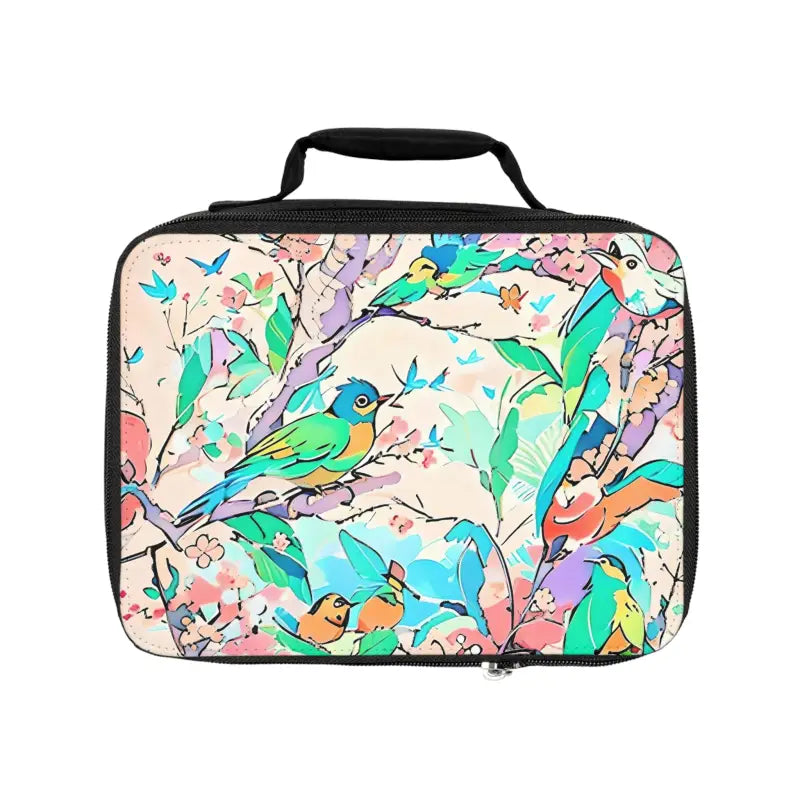 Print: Birds and trees lunch bag featuring vibrant, nature-inspired colors and playful patterns.