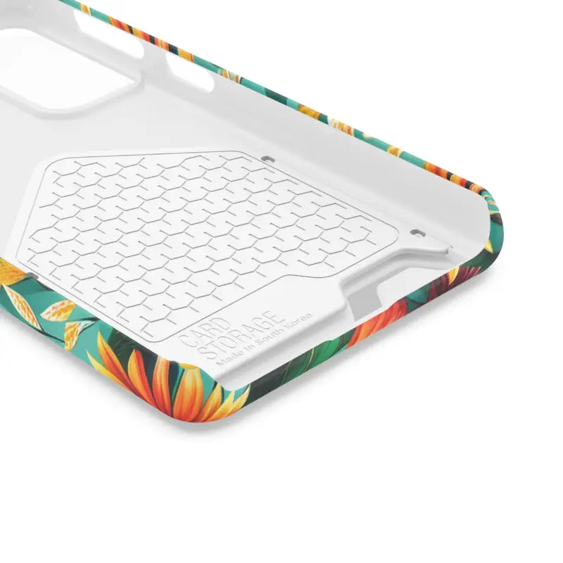 Experience the perfect mix of functionality and fashionable charm with this phone case featuring vibrant flowers. Embrace the convenience of a built-in card holder and let the playful design, including hints of orange flowers, accentuate your style every day. Get yours now and make your phone a true fashion icon!