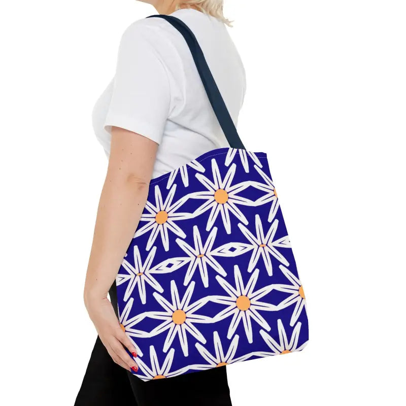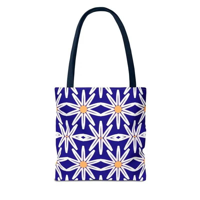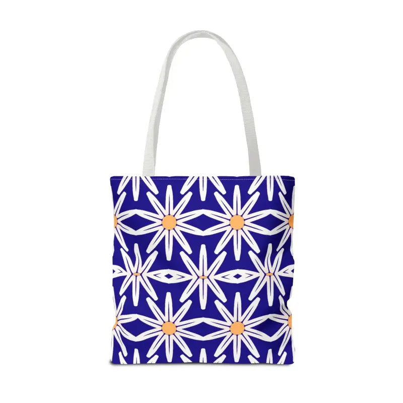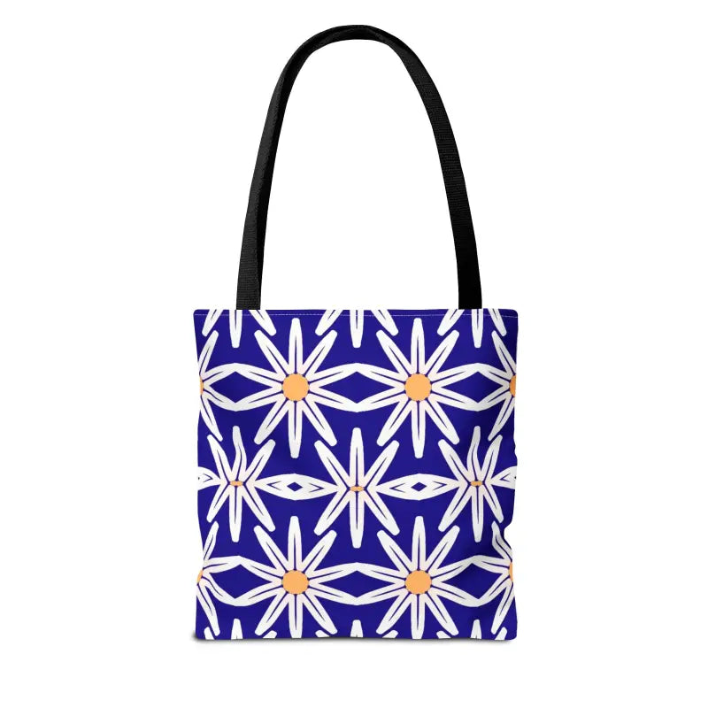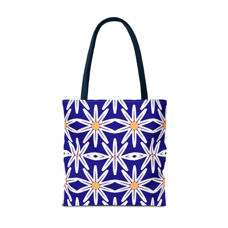 Ready to stand out in a sea of boring bags? Unleash your bold side with this geometric blue tote bag featuring an eye-catching white floral pattern, perfect for adding a burst of color and style to every outing.