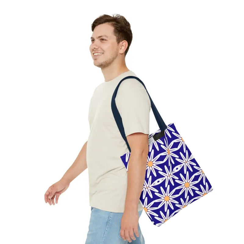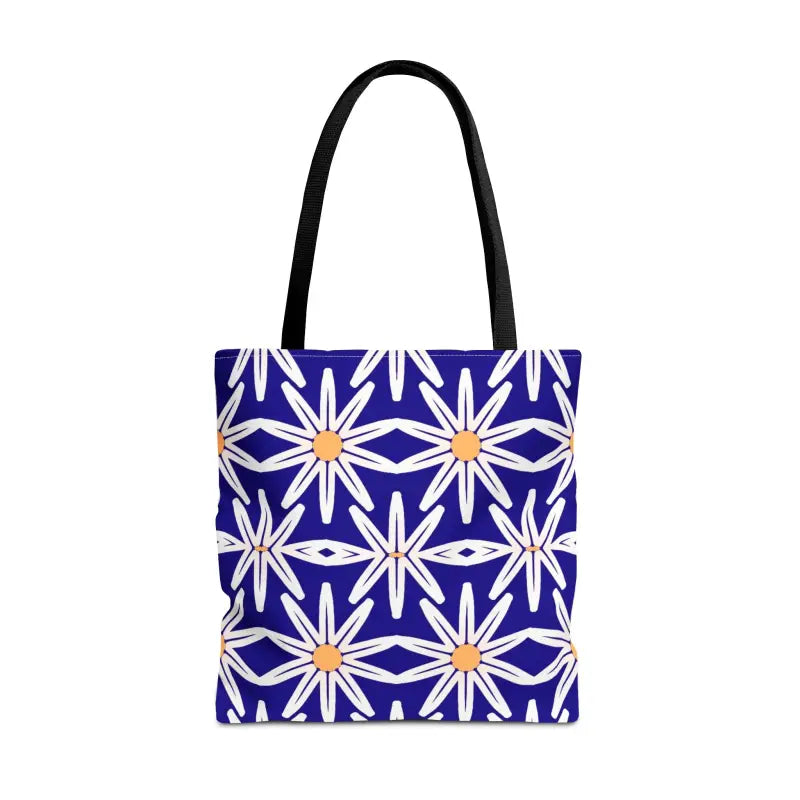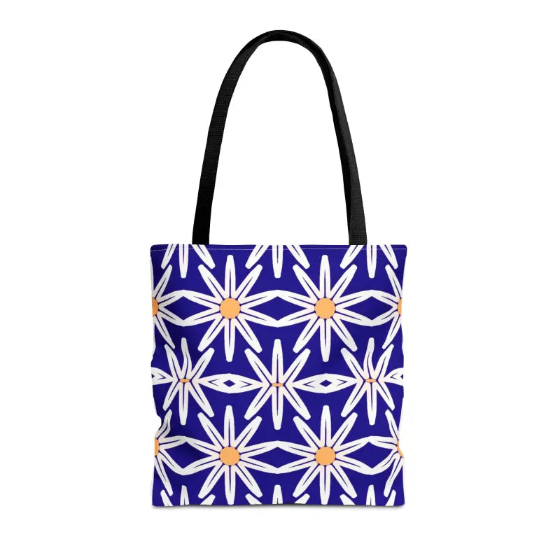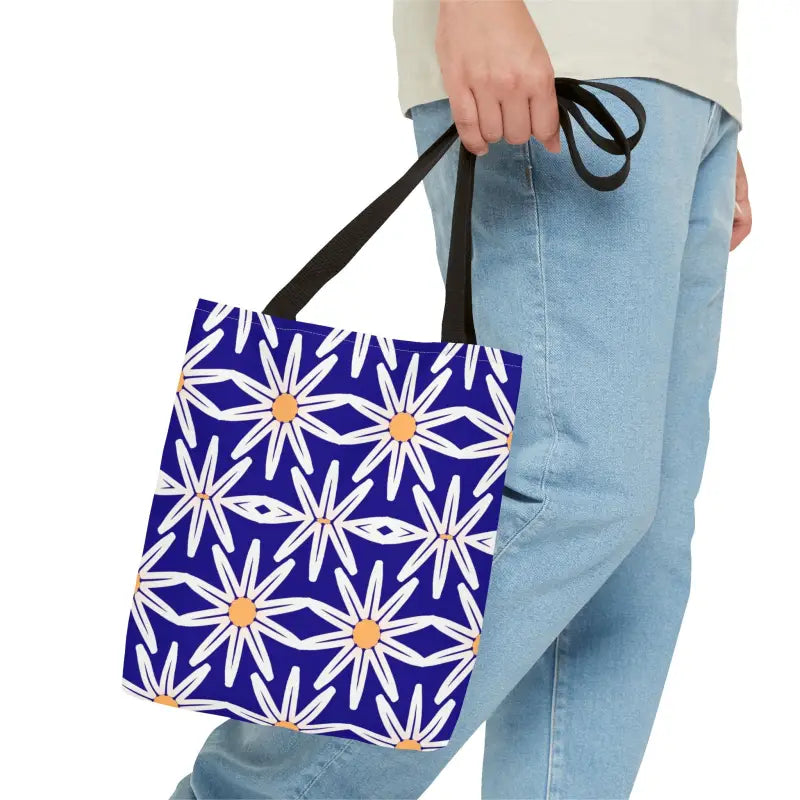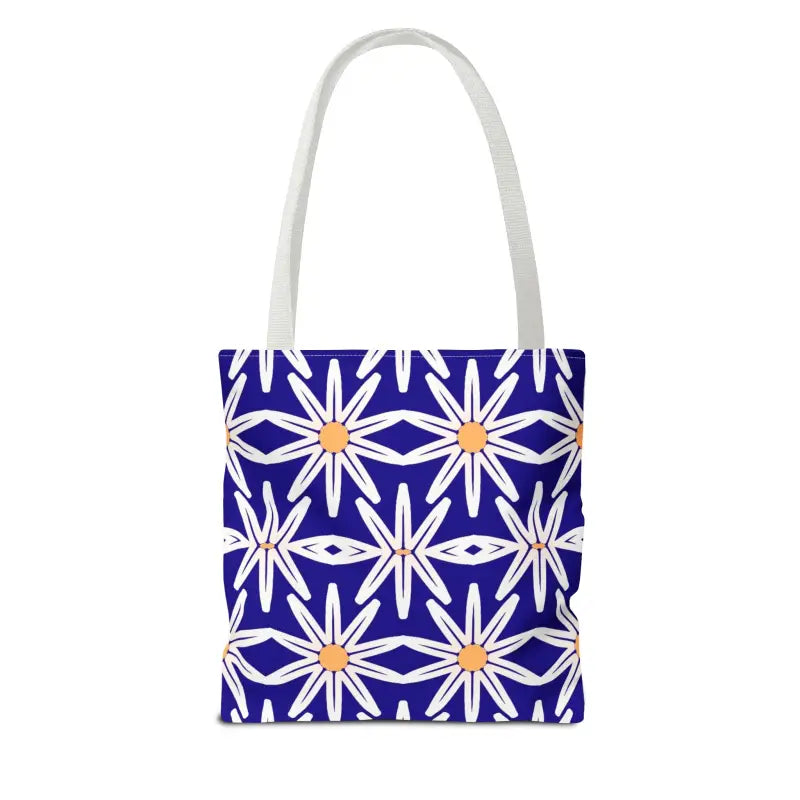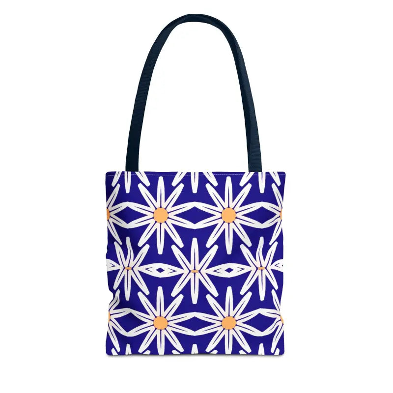 Ready to stand out in a sea of boring bags? Unleash your bold side with this geometric blue tote bag featuring an eye-catching white floral pattern, perfect for adding a burst of color and style to every outing.