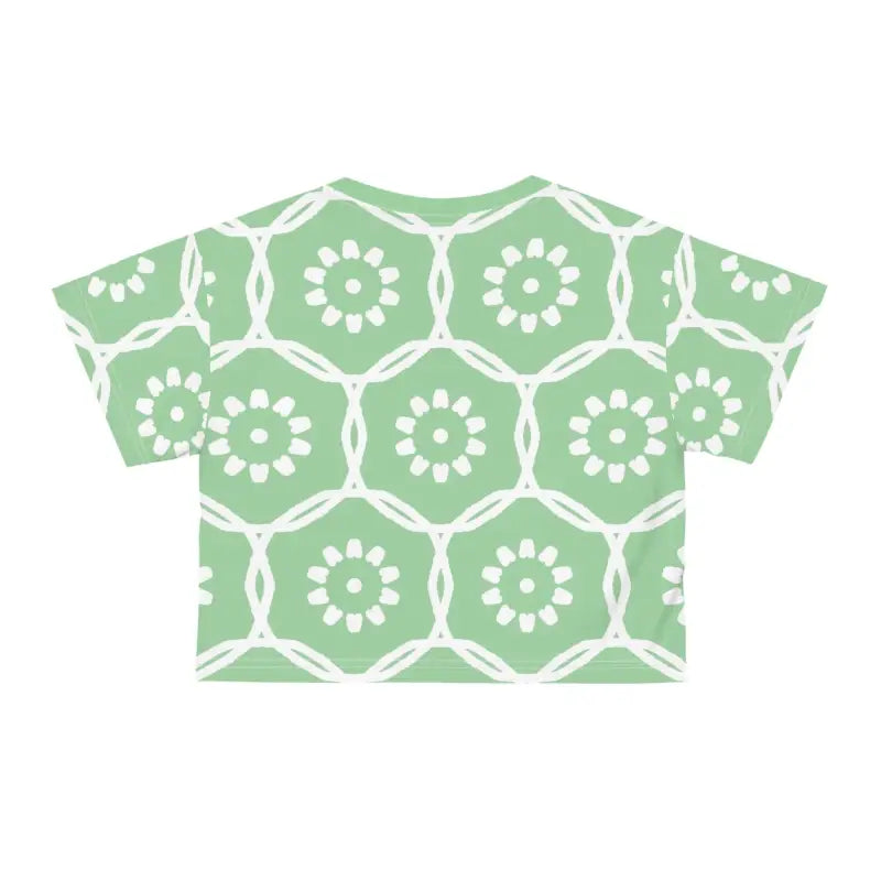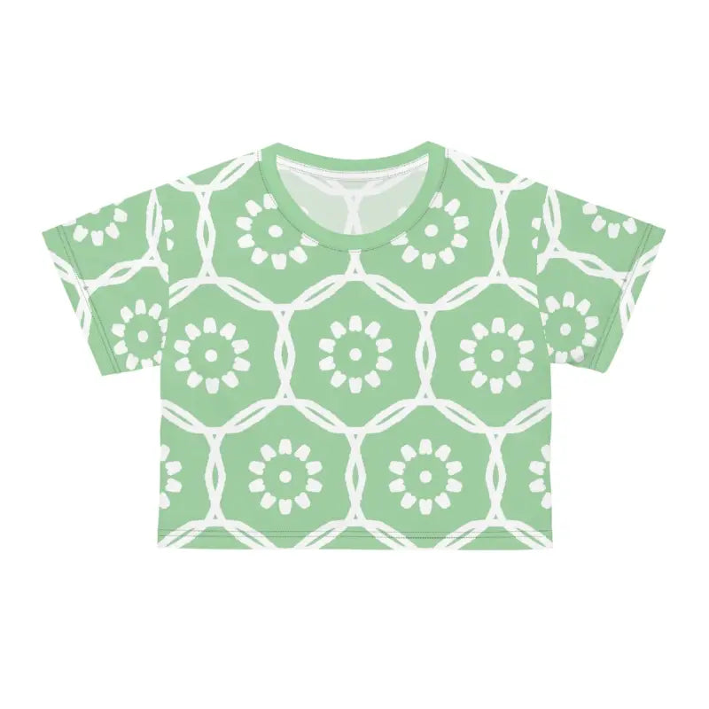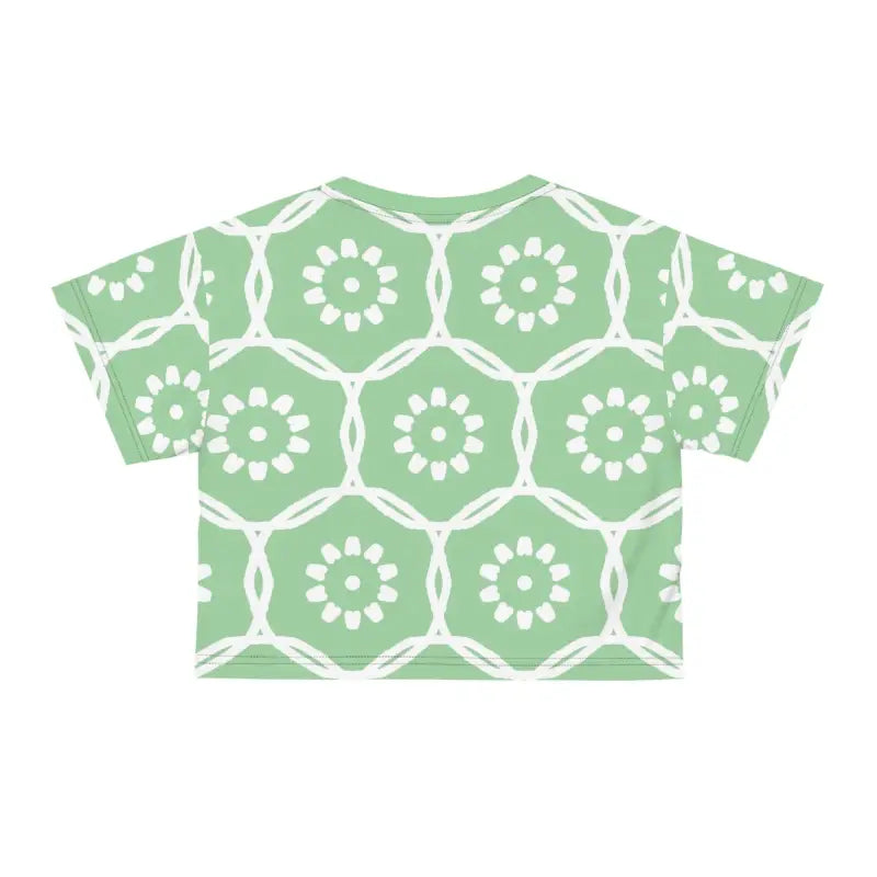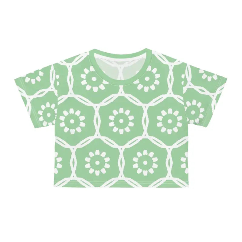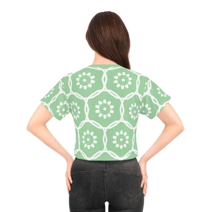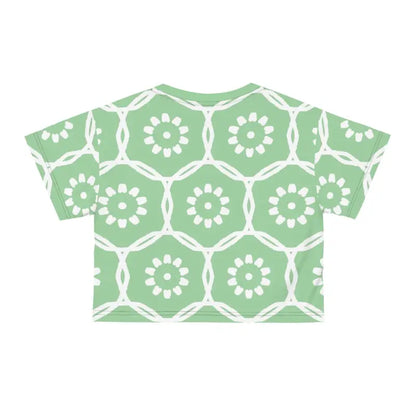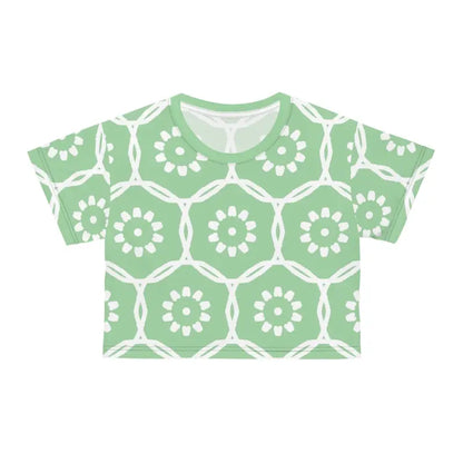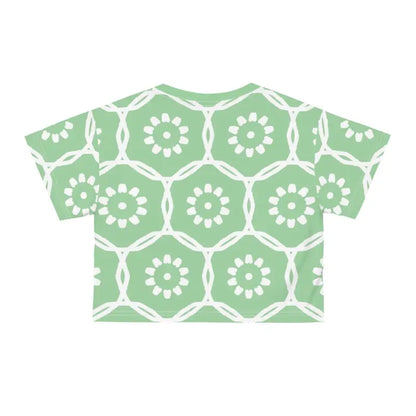 Life is too short to wear boring clothes, and this stunning crop tee is here to make every moment a fashionable one. There's never been a better time to transform your wardrobe into a captivating showcase of style and comfort. Don't miss out on the chance to make this trendy piece yours and watch it become your wardrobe's shining star. Step into a world of effortless elegance and let the White Flowers on Pastel Green AOP Crop Tee lead the way. Get ready to turn heads and steal hearts—this crop tee is calling your name!