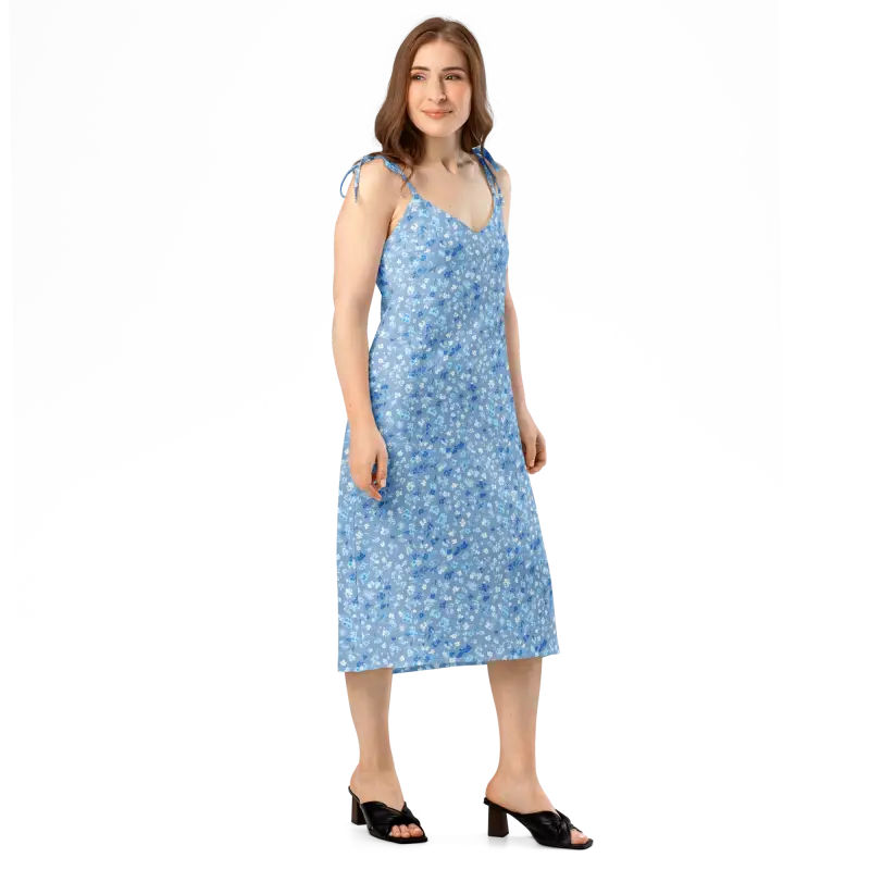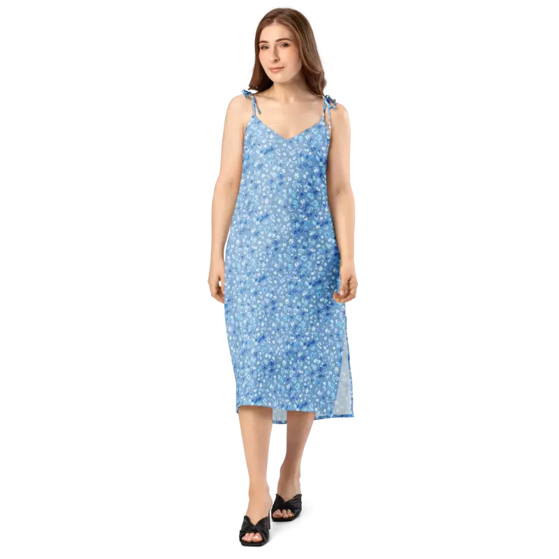 The floral capri blue print is where this dress really shines—tiny scattered blooms in varying shades of blue create a vintage-inspired ditsy pattern that whispers feminine charm without screaming for attention. This design speaks to the woman who knows her worth, who appreciates timeless elegance but isn't afraid to stand out, who values both comfort and style in equal measure. The thoughtful side slit adds just the right amount of flirtiness while making movement easy and natural, whether you're dancing, walking, or simply existing in your gorgeous skin.