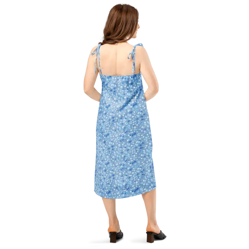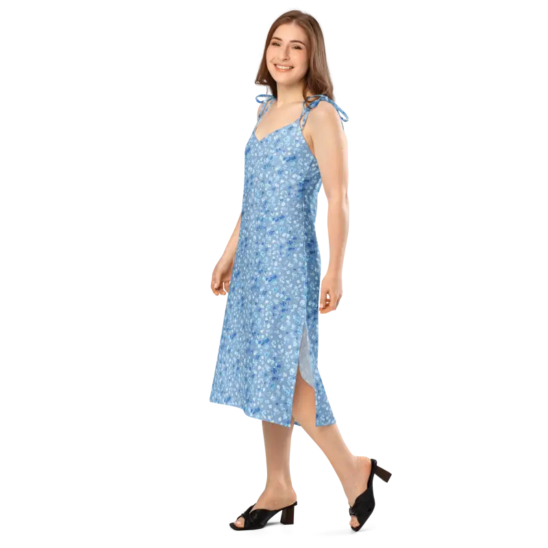 Picture yourself stepping into a sun-drenched garden party, the soft breeze catching the floaty hem of your ditsy floral capri blue dress as heads turn to admire your effortlessly chic style. This isn't just another dress hanging in your closet—it's your secret weapon for looking absolutely stunning without even trying. The delicate ditsy floral pattern in gorgeous capri blue tones dances across the fabric, creating a romantic, whimsical vibe that makes you feel like the main character in your own story. Whether you're sipping mimosas at brunch, exploring a weekend farmer's market, or twirling under string lights at an evening soirée, this midi dress moves with you like a dream. The adjustable tie straps let you customize the perfect fit while showing off your shoulders, and the built-in bra means you can ditch the fussy undergarments and just enjoy your day. Crafted from 100% heavy polyester chiffon at a substantial 5.9 oz weight, this beauty strikes that perfect balance between lightweight airiness and quality construction that actually holds its shape and drapes beautifully against your body.