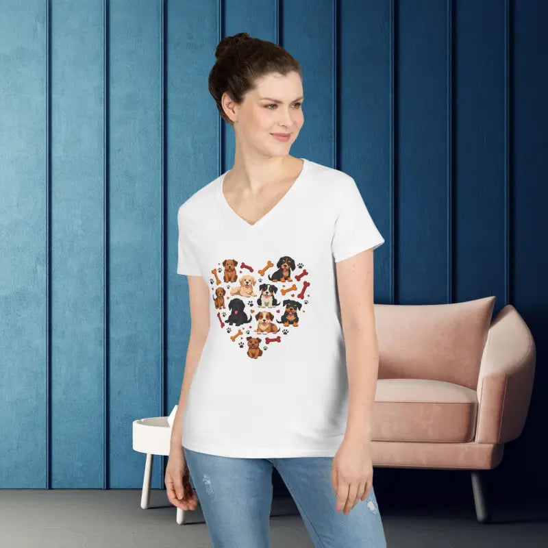 Ready to flaunt your dog-loving heart? This Dog Lovers V-neck T-shirt for women is here to turn heads with its adorable heart design, blending playful fashion with cozy comfort!