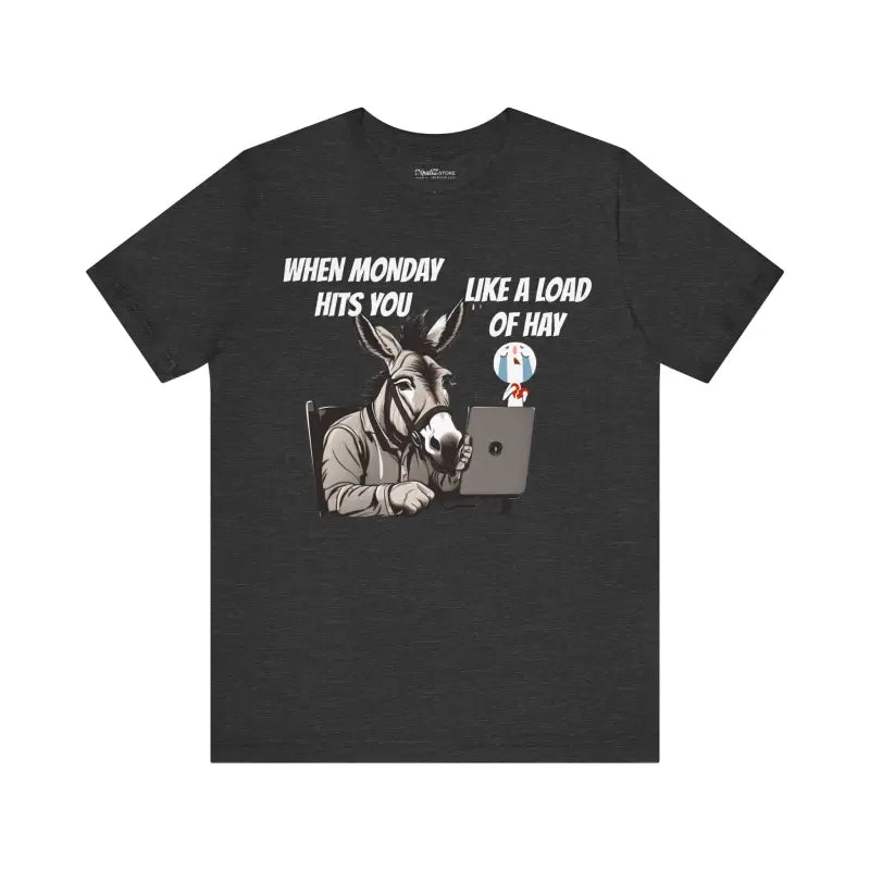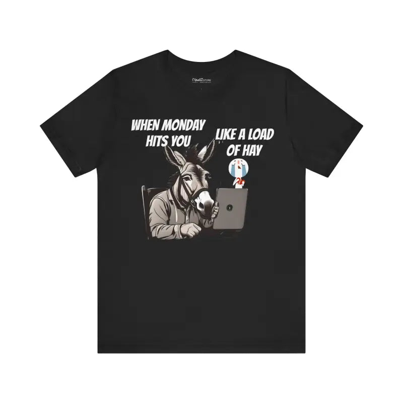 Kickstart your week in style with the "Donkey Mondays" unisex jersey short sleeve tee! Imagine a donkey at a computer, perfectly capturing that Monday mood when it hits you like a load of hay. This classic unisex jersey short sleeve tee is designed for comfort and style, fitting like a well-loved favorite. Made with soft cotton and top-notch print quality, you'll fall in love with this t-shirt over and over again. Ribbed knit collars add shape, while tapered shoulders ensure a great fit. Dual side seams keep the garment's shape intact for longer wear.