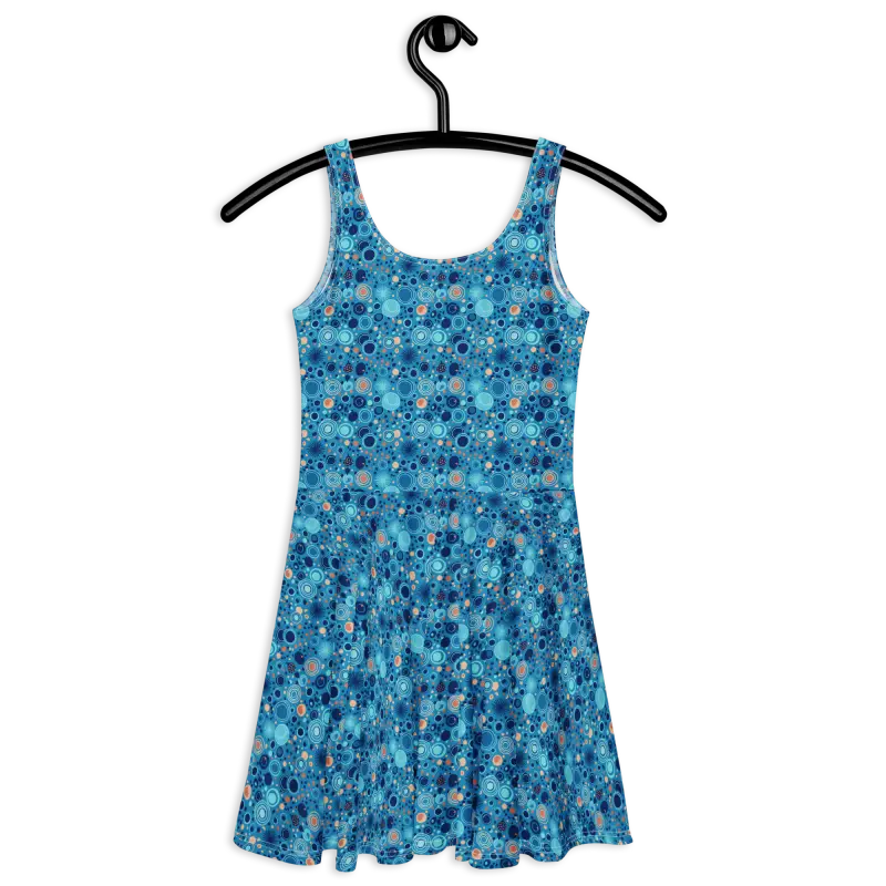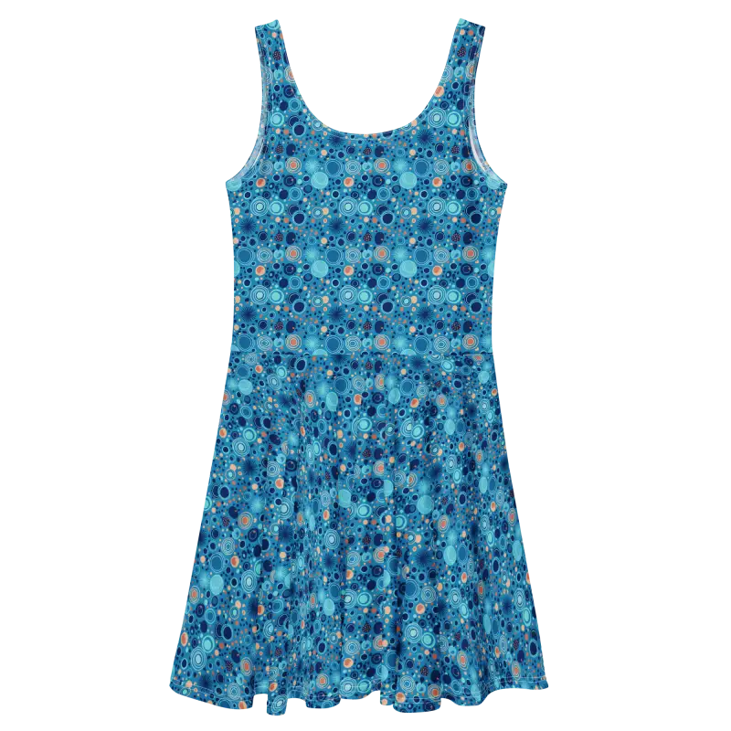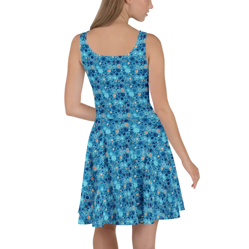The intricate dot pattern against the stunning capri blue background creates a visual rhythm that's both playful and sophisticated, speaking to your ability to balance fun with elegance in everything you do. This design doesn't whisper—it celebrates your bold personality and your refusal to blend into the background. Wear this skater dress to your next outdoor concert and pair it with sneakers for an effortlessly cool vibe, throw on some strappy sandals for a dinner date that demands something special, layer it with a denim jacket for casual Friday at the office, style it with ankle boots for a fall festival, or dress it up with statement jewelry for that wedding reception on your calendar. The versatility of this dot capri blue piece means it works as hard as you do, transitioning seamlessly from daytime adventures to evening celebrations without missing a beat.