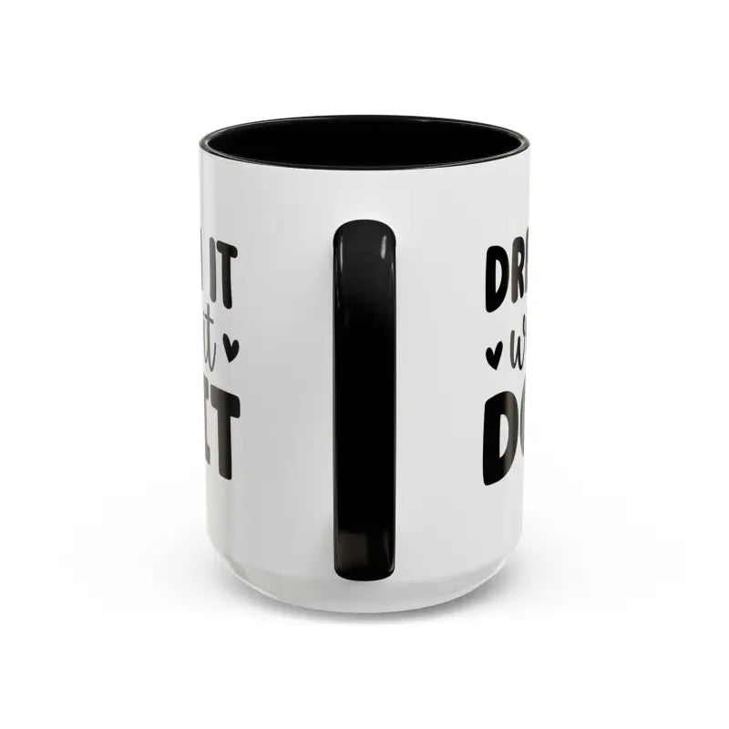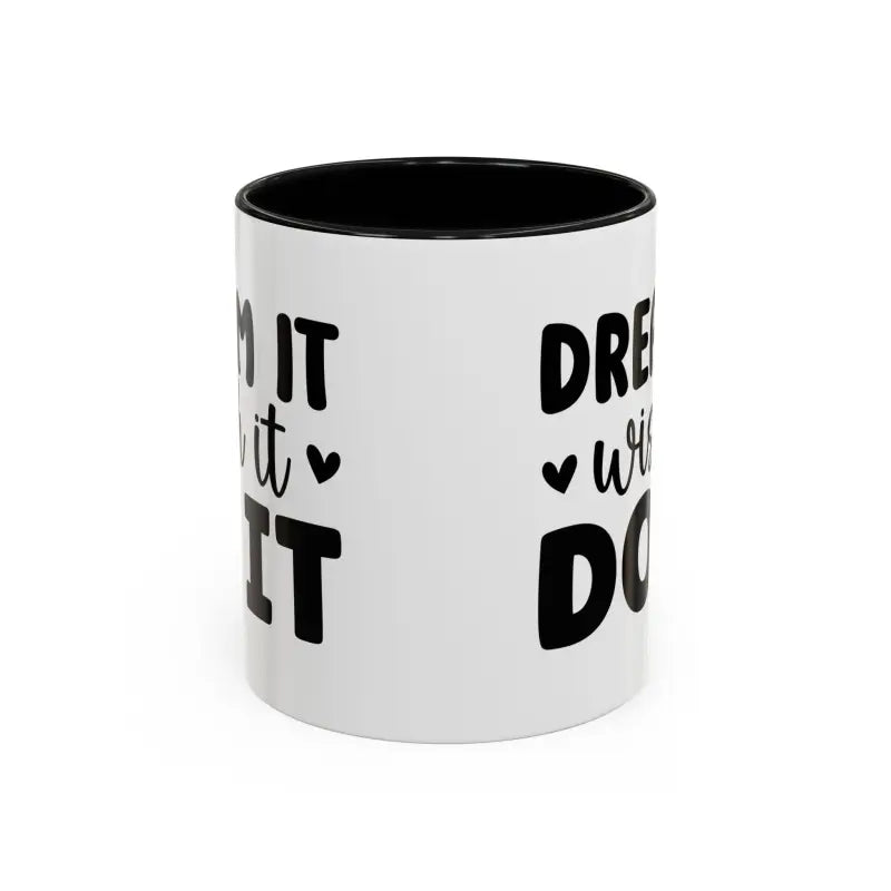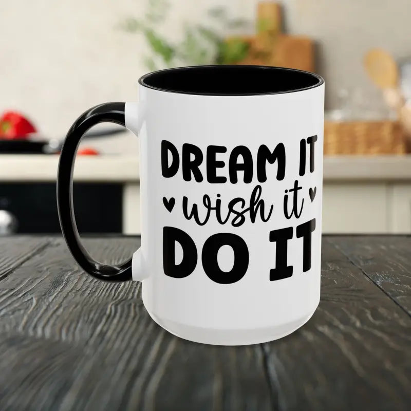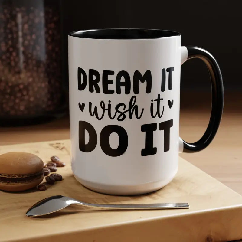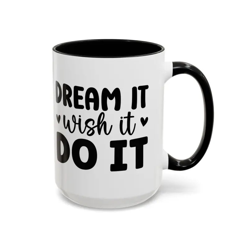 Dream it, wish it, do it, Accent Coffee Mug (11, 15oz). Meet your next favorite morning companion, the accented ceramic mug. This mug brings the perfect blend of style and functionality to elevate your coffee or tea ritual. Available in two generous sizes, 11oz (0.33 l) and 15oz (0.44 l), this mug offers ample space for your favorite brew. Made with white ceramic and sporting a sleek glossy finish with eye-catching contrast, this mug is a bliss both to use and to look at. The ergonomic C-shaped handle provides a comfortable grip, while the lead and BPA-free construction guarantee peace of mind with every sip.