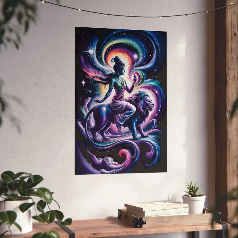Unleash divine feminine power into your space with this stunning Durga Goddess poster featuring a mesmerizing mystic lion constellation against a backdrop of swirling cosmic purples and midnight blues that practically glow with otherworldly energy.
