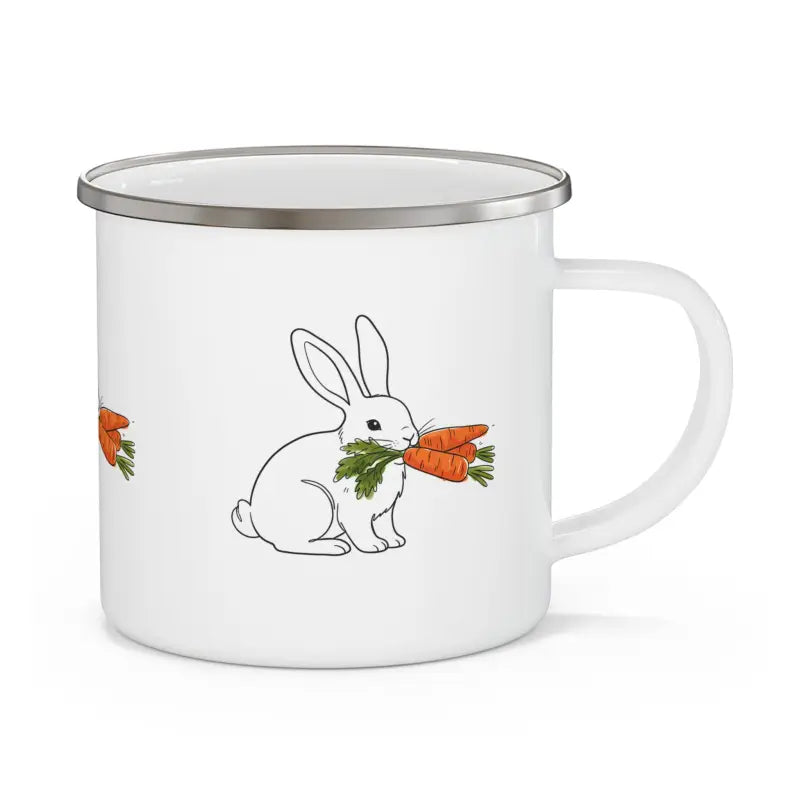 Picture this: you're cradling a warm mug as the sun peeks through pine trees, steam curling up into crisp morning air, and a cheerful little bunny munching carrots is keeping you company right there in your hands. This enamel camping mug brings pure joy to every sip whether you're miles deep in the backcountry or just pretending to be wild from your back porch. The adorable cute bunny eating carrots pattern wraps around the entire surface in a charming sketch style that feels hand-drawn and personal, like someone illustrated it just for you. At a perfect 12 oz capacity, it holds enough coffee to actually wake you up or enough hot cocoa to warm you through those chilly evenings when the fire's crackling and the stars are coming out. The white enamel finish creates a clean, classic canvas that makes those bright orange carrots and soft white rabbit details absolutely pop with personality. This camping mug isn't just functional gear, it's a conversation starter that tells everyone you appreciate the simple pleasures and don't take outdoor adventures too seriously. The rust-resistant stainless steel core underneath that glossy enamel coating means this little beauty can handle everything from rocky trail breaks to sandy beach bonfires to clumsy morning fumbles when you're barely awake. Use it for your daily kitchen table ritual when you need something cheerful to start the day, pack it in your backpack for mountain summit celebrations, bring it car camping for that authentic outdoorsy vibe, set it out at picnics where kids and adults alike will smile at the whimsical design, or keep it at your desk as a delightful reminder that adventure is always just around the corner.