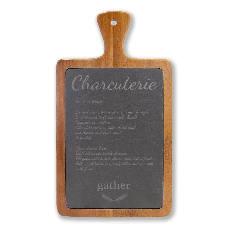 - Laser-engraved slate circle in soft grey adds a personalized touch. Subtle yet striking contrast highlights every cheese label and charcuterie slice.