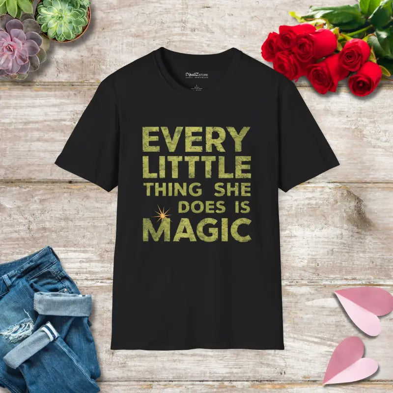 Step into a realm of comfort and casual style with the Everything She Does is Magic Softstyle T-Shirt. This isn't just a regular tee—it's an experience of softness and durability that elevates your everyday wear. Crafted from 100% cotton in solid colors, this magical cotton tee is designed for those who cherish comfort without compromising on style. Feel the cozy embrace of soft materials as you make a bold statement in fashion.