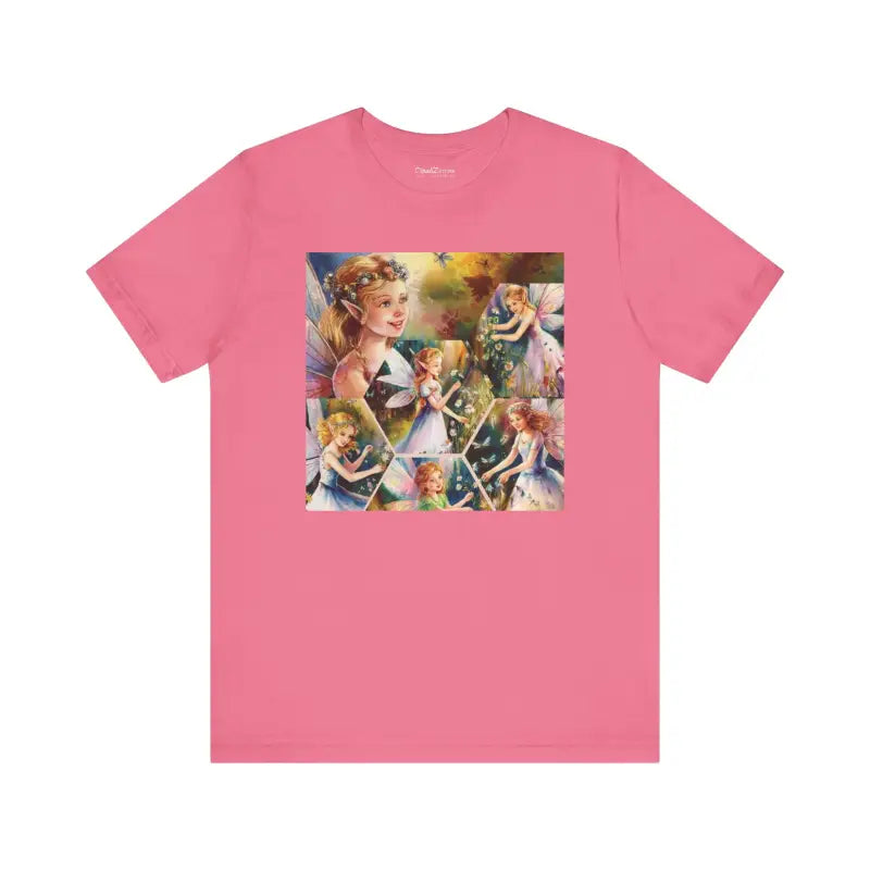 Fairy in an enchanted forest, Unisex Jersey Short Sleeve Tee. This classic unisex jersey short sleeve tee fits like a well-loved favorite. Soft cotton and quality print make users fall in love with it over and over again. These t-shirts have-ribbed knit collars to bolster shaping. The shoulders are tapered for a better fit over time. Dual side seams hold the garment's shape for longer.