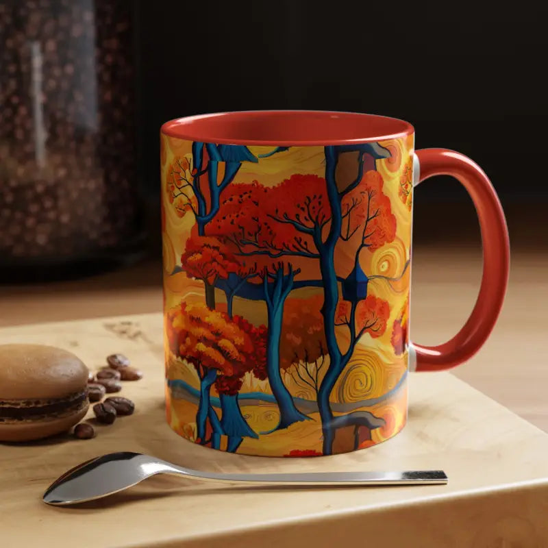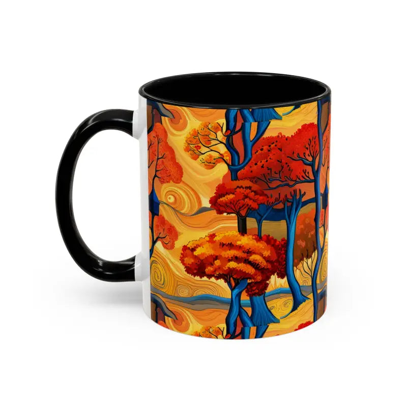 Fall trees in Autumn season, Accent Coffee Mug, 11oz. Add some color to your routine with this two-tone, accent coffee mug. This 11oz mug features an accented C-Handle that is comfortable to use, as well as an accented interior to add more contrast and character.ย