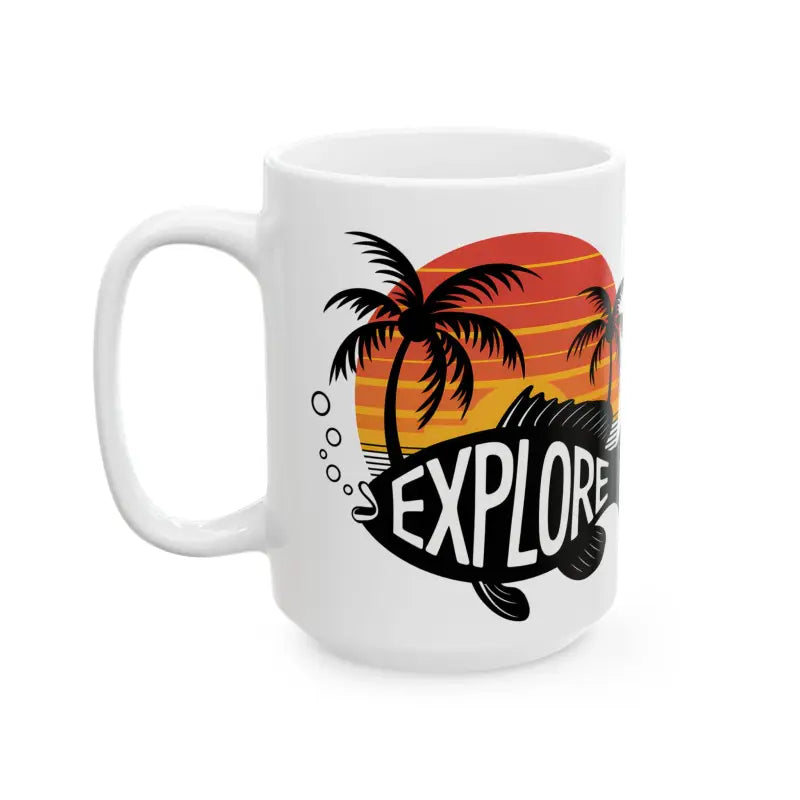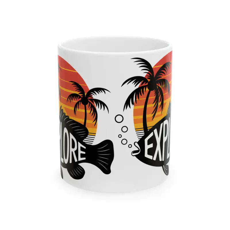 Print: Bold and artistic, the mug features a stunning island scene surrounded by stylish, colorful fish, setting the perfect island vibe for any occasion.