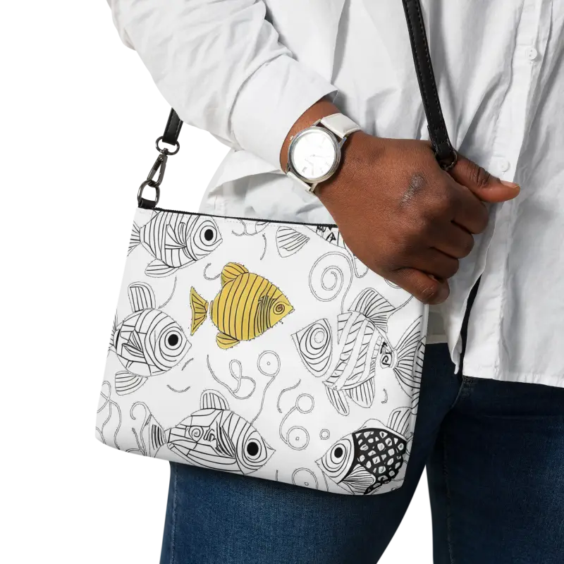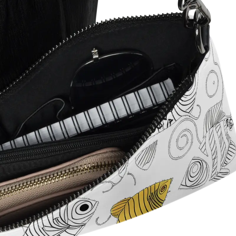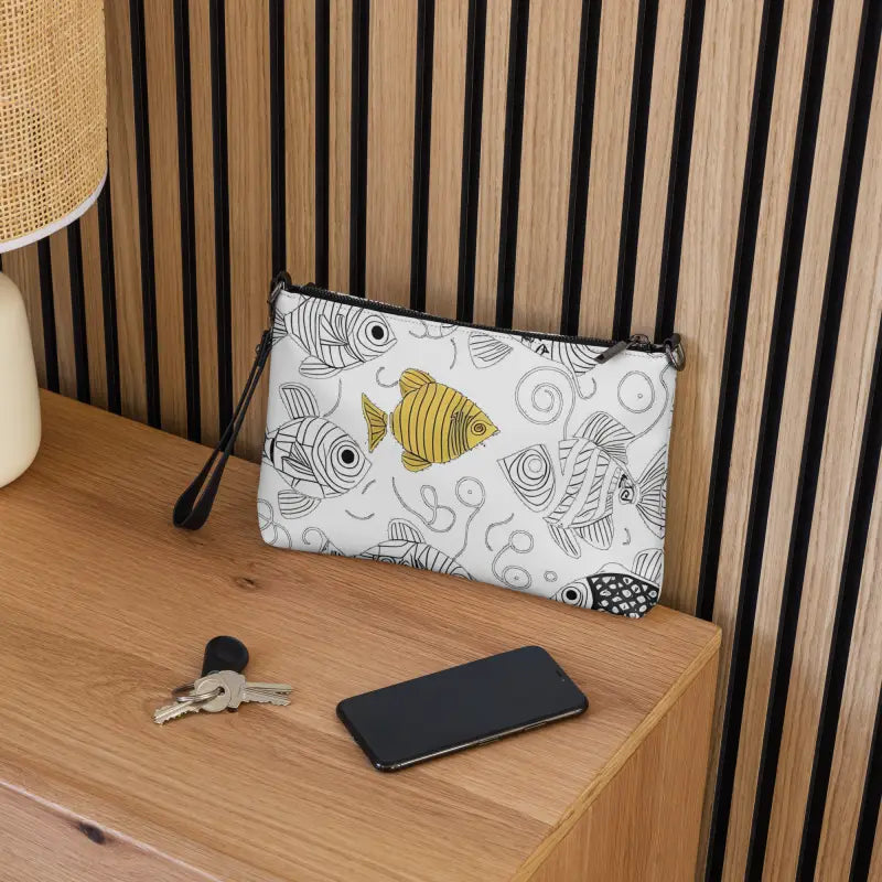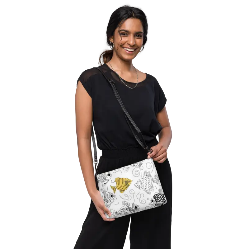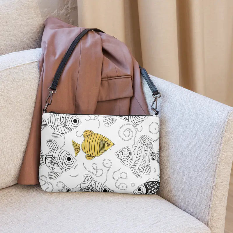 The bold black-and-white fish print dances across the bag’s structured silhouette, giving a graphic edge to its curved corners and compact shape. Dark gray accents frame the pattern, creating chic contrast that stands out in any crowd.