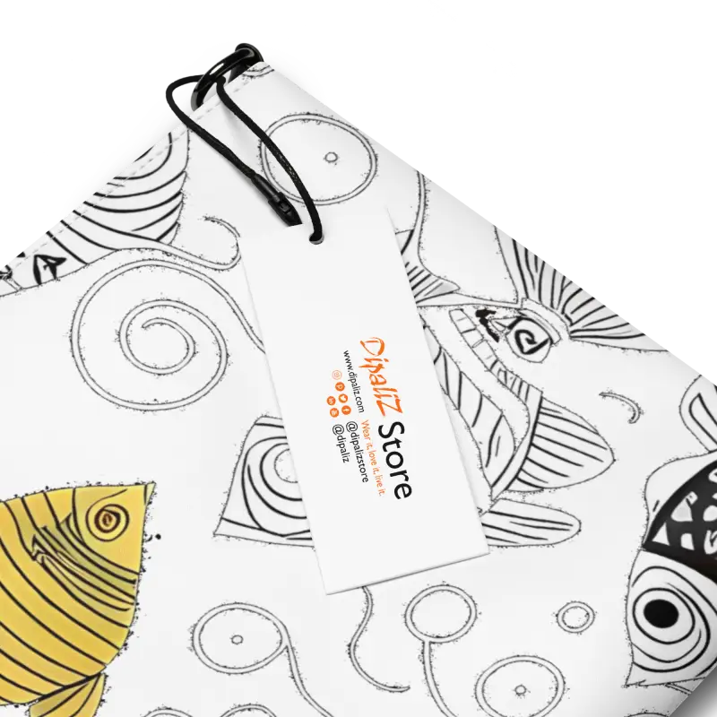 Monochrome fish motif in black and white with pops of dark gray for high-contrast drama and modern energy.