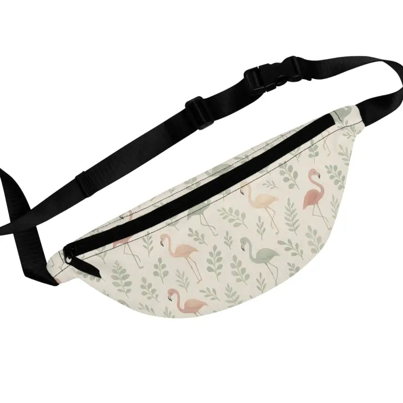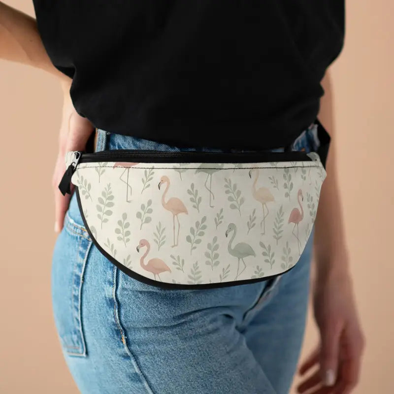 Print: Bold flamingo print in vibrant hues gives this flamingo print fanny an eye-catching look for festivals, travels, or any casual outing.
