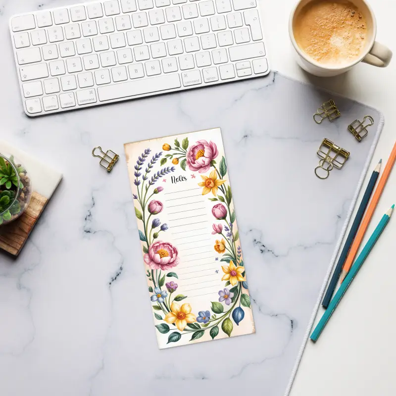 Brighten every day with this bold floral border notepad, designed to add cheerful energy to your workspace. Say goodbye to dull note-jotting—a stunning floral border makes organization a real pleasure while ensuring every important task and idea stands out. Whether parked on a busy office desk, at the hub of the kitchen counter, or tucked into a creative nook, this border notes notepad keeps inspiration flowing and chaos at bay. Tackle shopping lists, daily tasks, and off-the-cuff thoughts with something beautiful, functional, and always ready to go.