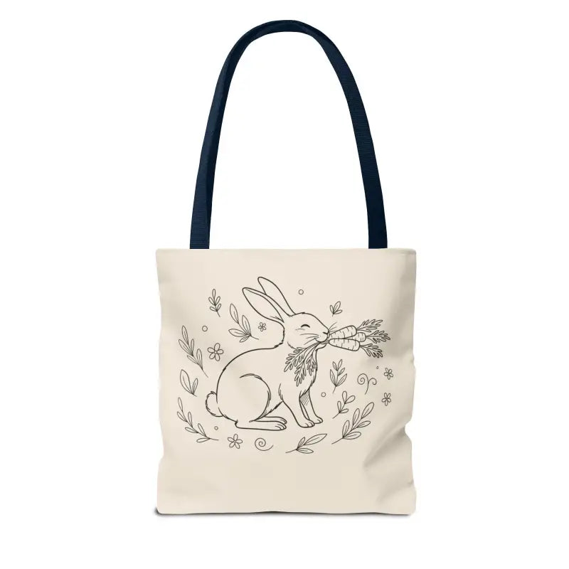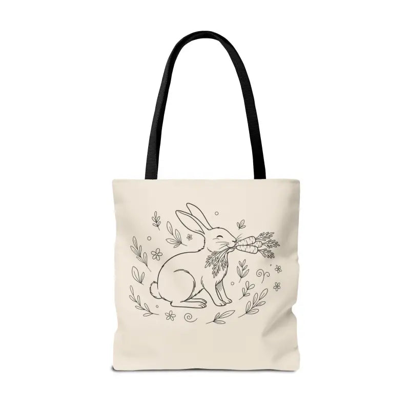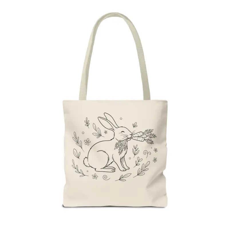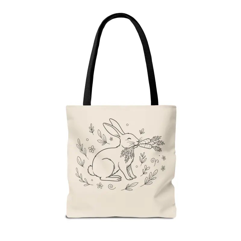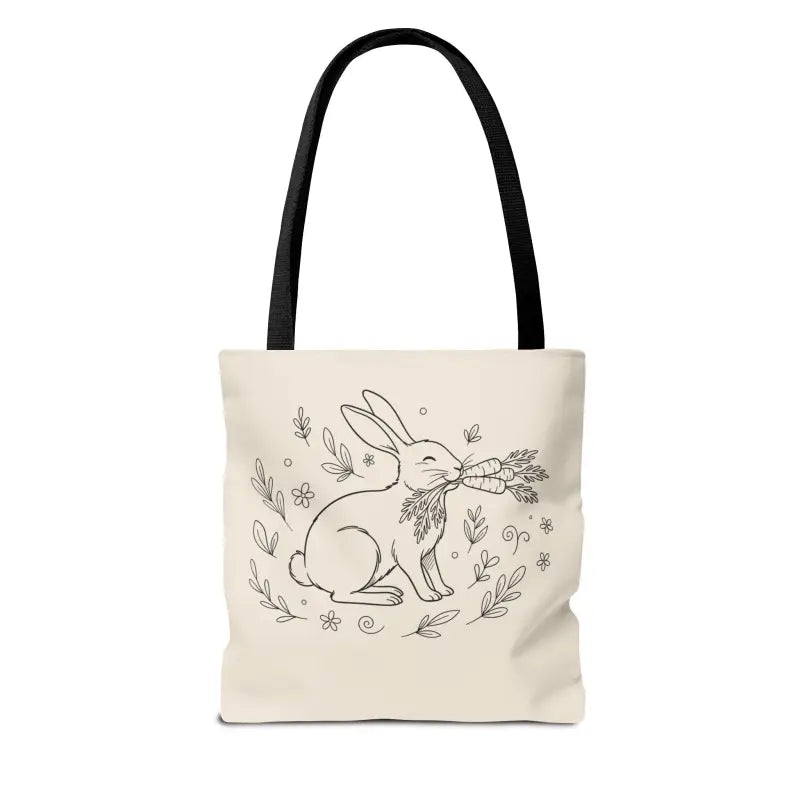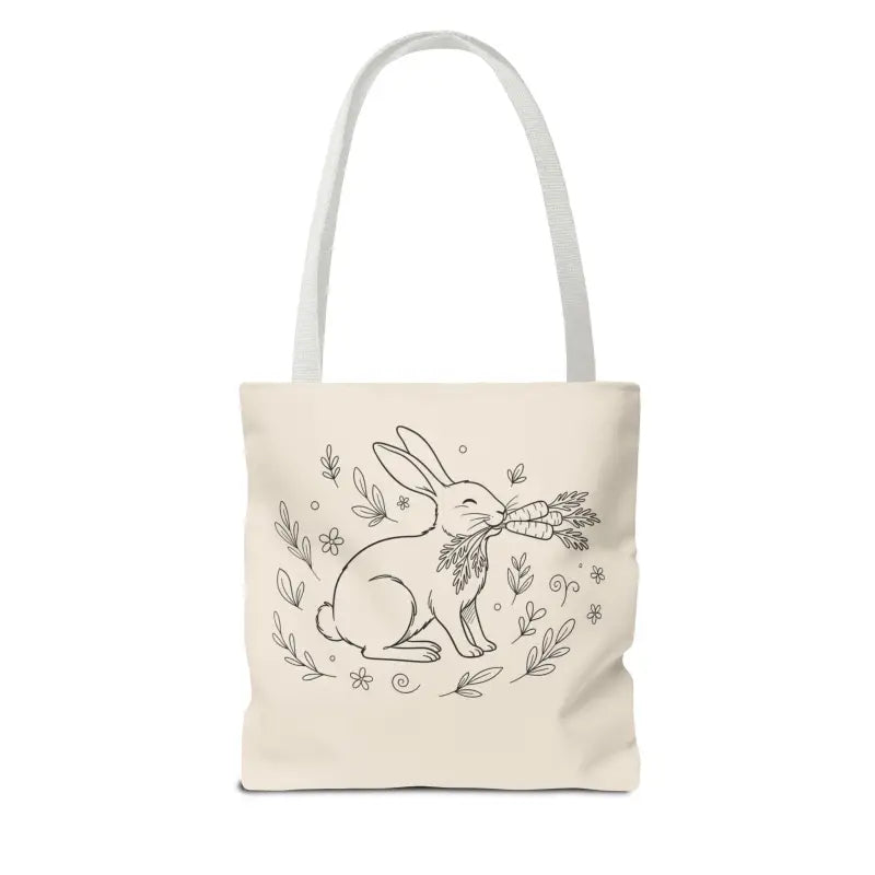 - Cream-colored natural canvas base showcases the floral bunny illustration with soft botanical details that complement any wardrobe from casual jeans to flowing dresses