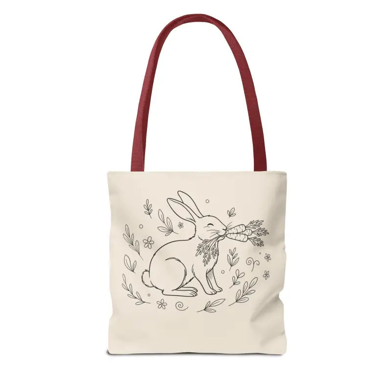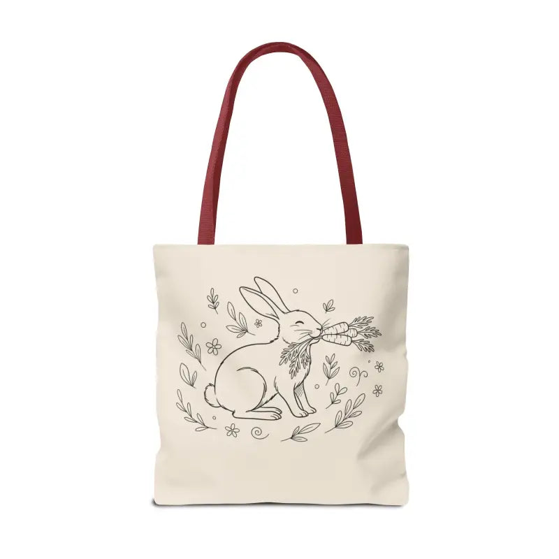 The rabbit canvas tote showcases a beautifully detailed line-drawn bunny nestled among delicate wildflowers and foliage, all rendered in soft, earthy tones against a natural cream background that whispers cottagecore dreams and slow-living aspirations. This design speaks to the part of you that values gentleness, connection to nature, and finding beauty in simple moments—the version of yourself who chooses handwritten notes over texts and weekend picnics over crowded restaurants.