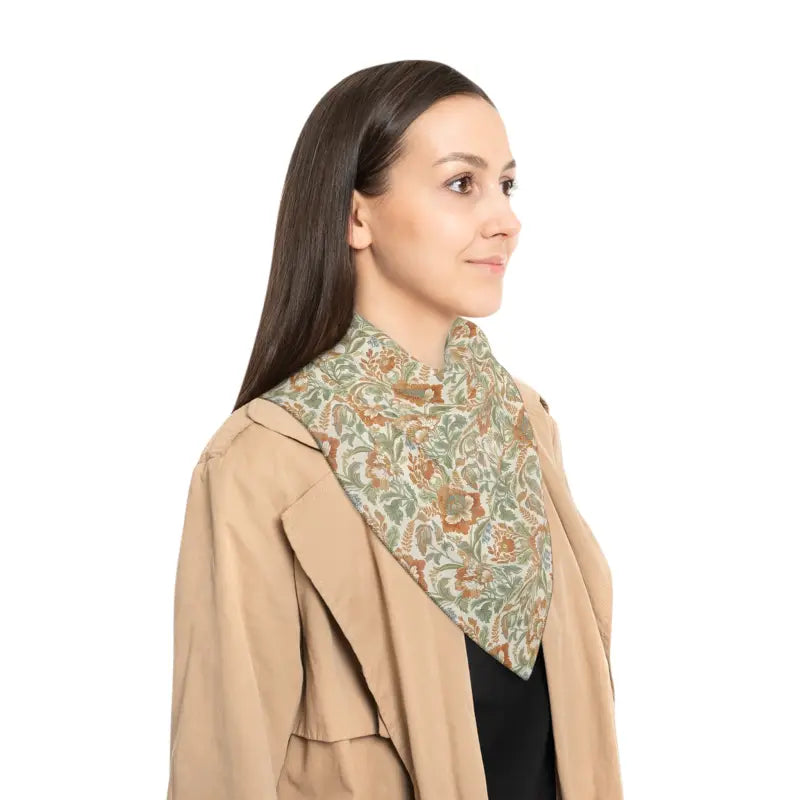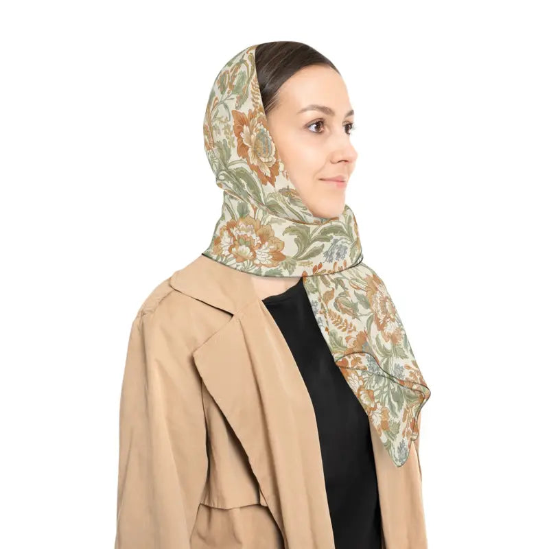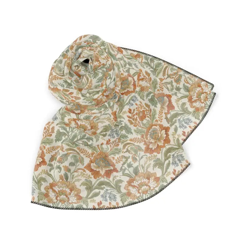 Picture this: you're stepping out into a golden-hour evening, and the breeze catches the edge of your scarf just right, sending soft folds of vintage peach and sage dancing around your collarbone. This floral damask poly scarf isn't just another accessory tossed into your rotation—it's that finishing touch that makes strangers do a double-take and friends ask where you found it. The whisper-light polyester drapes like silk without the fuss, flowing effortlessly whether you're knotting it loosely at your throat or letting it cascade over your shoulders at an outdoor gathering. That muted terracotta and sage pattern carries all the charm of a thrifted treasure from decades past, the kind of piece that looks like it has stories to tell even though it just arrived at your door. The black overlock stitching frames every edge with artisanal precision, adding just enough structure to keep the fabric from feeling too delicate while maintaining that breezy, carefree vibe you're after.
