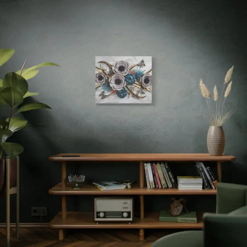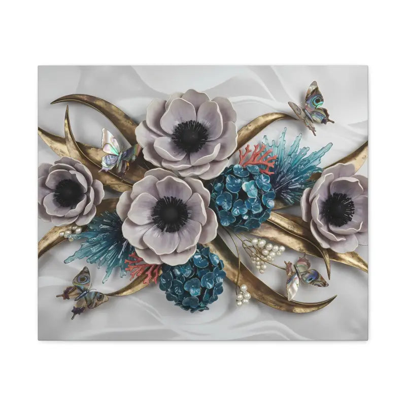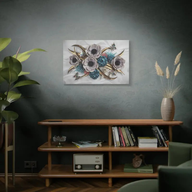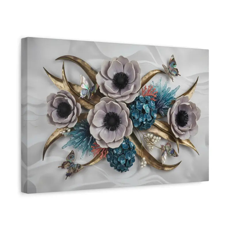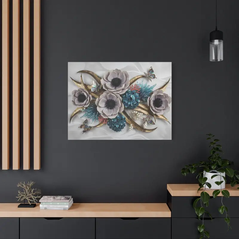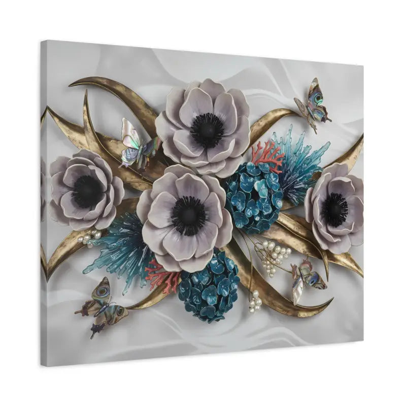 Bring instant serenity and style to your walls with this floral elegance matte canvas art that glows with soft sophistication. White anemones bloom against teal hydrangeas and golden accents, creating a dreamy balance of calm and luxury. Every brushstroke feels alive, turning everyday walls into a gallery of texture and light.