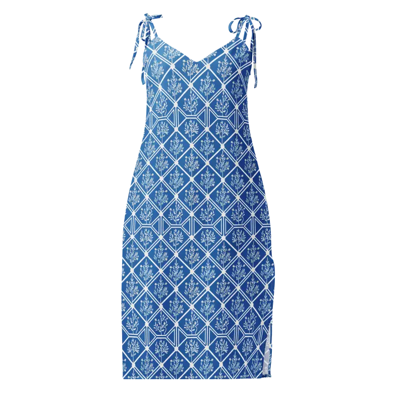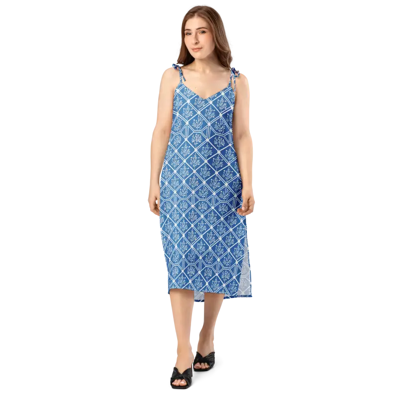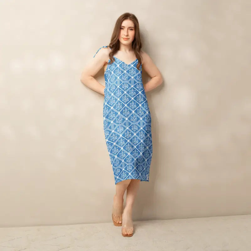 The geometric hexagon pattern dances across airy chiffon, creating a look that’s both modern and romantic. Designed for days that turn into nights, its adjustable tie straps and gentle side slit keep things cool and carefree.