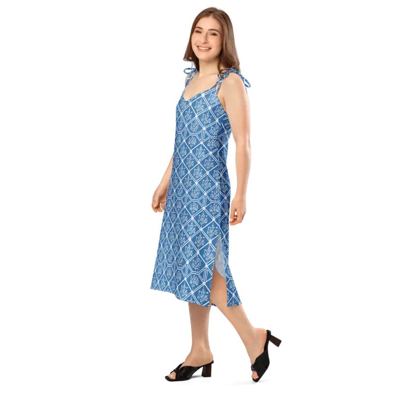 Floral Geometric Hexagon Midi Dress Breezy Tie-Strap Style