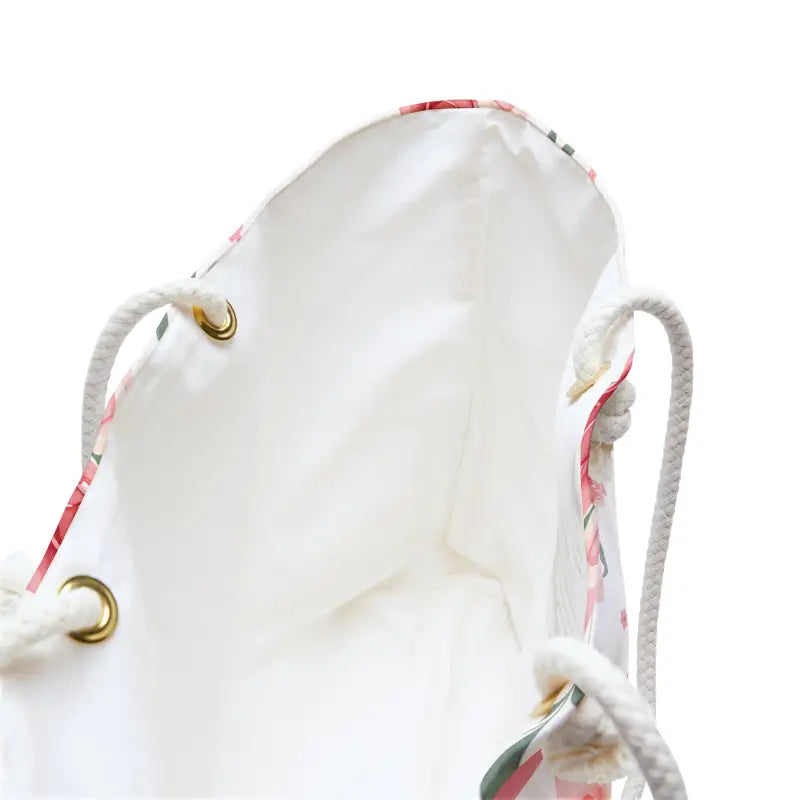 Material: Durable polyester-blend fabric with water-resistant coating, cream cotton rope handles, gold-tone metal grommets, polyester interior lining