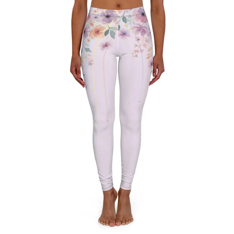 Picture yourself in the soft morning light, slipping into leggings that feel like a watercolor painting came to life against your skin. These floral pastel yoga leggings transform your entire vibe with delicate blooms that seem to float and breathe as you move through your day. The soft watercolor flower print creates an almost dreamlike quality, turning heads without shouting for attention, while the pale hues whisper sophistication and artistic flair. Every stretch, every pose, every casual stride becomes part of a living canvas that celebrates both your active lifestyle and your eye for beauty. The near-white base lets those gentle floral tones take center stage, making you feel like you're wearing art that actually works as hard as you do.