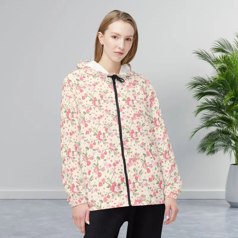 Floral Pink Rose All-Over Print Windbreaker Jacket. Light as a spring breeze, this floral windbreaker wraps you in a soft wash of vintage roses and pale greenery. It’s the kind of layer you reach for on cool morning walks, farmers’ market runs, or when a sudden drizzle threatens the picnic. The hood and full zipper give flexible coverage; elastic cuffs keep the sleeves snug while you’re biking or tending to errands. The print reads like a well-loved garden journal — subtle, feminine, and quietly joyful — so it slips easily into a capsule wardrobe without shouting. Wear it over a linen dress or a favorite tee and let the faded-rose pattern do the talking on breezy city strolls and weekend outings.