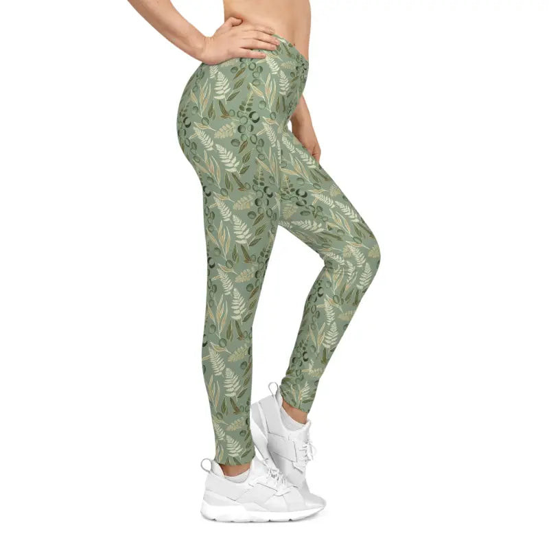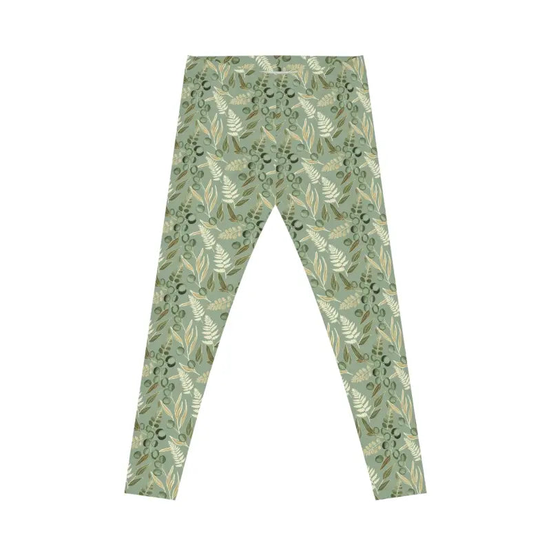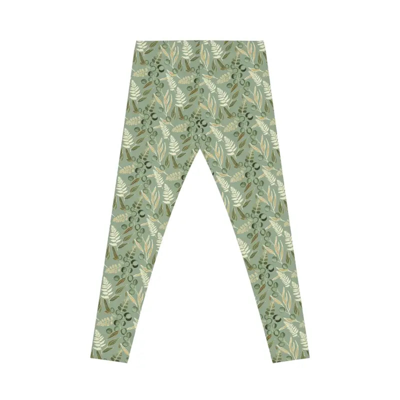 The silky-smooth stretch fabric moves with your body like it was custom-made just for you, offering that lightweight feel that never weighs you down or restricts your flow. The slim mid-rise waistband hugs your hips comfortably without digging in or rolling down, giving you that secure fit that stays put through every bend, stretch, and step. Every inch of these leggings features a gorgeous layered leaf motif in muted sage tones that captures the peaceful beauty of woodland walks and olive groves, creating a visual story that's both sophisticated and grounded. This isn't just another pair of basic leggings—the floral sage pattern makes a statement about who you are: someone who values nature-inspired style, thoughtful design, and that perfect blend of comfort and creativity.