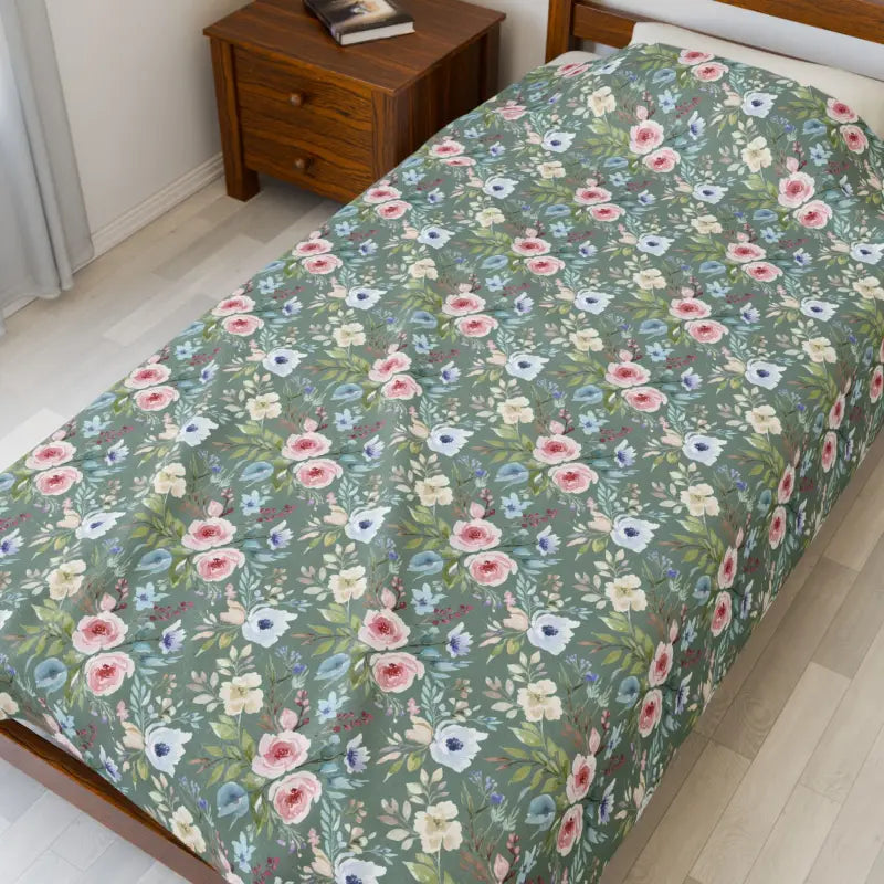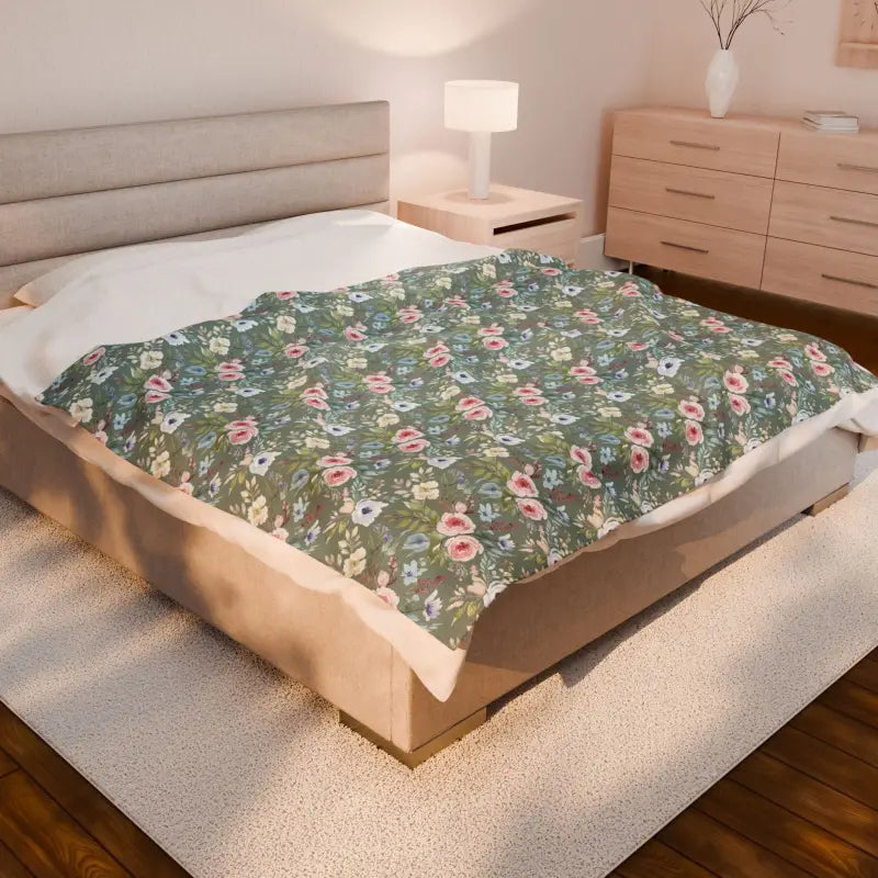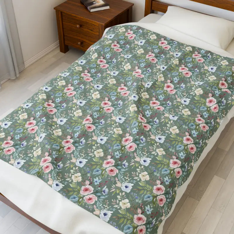 The medium heavy-weight construction gives you that cozy, substantial feel without making you feel weighed down or overheated—it's that sweet spot where comfort lives. Every inch of this velveteen plush delivers an incredibly smooth, almost buttery texture that glides across your skin and stays soft wash after wash. The sage background creates a calming foundation while tiny rosebuds and scattered wildflowers dance across the surface in a pattern that feels both nostalgic and fresh. This design doesn't just look pretty—it tells everyone who sees it that you appreciate timeless beauty, natural elegance, and the art of creating a home that feels like a sanctuary. Whether you're draping it over your reading nook for those early morning coffee sessions, keeping it on the couch for spontaneous afternoon naps, throwing it in your car for outdoor concerts and picnics, layering it at the foot of your bed to add that perfect finishing touch to your bedroom aesthetic, or packing it for weekend getaways where hotel rooms need a dose of personality, this blanket adapts to wherever life takes you.
