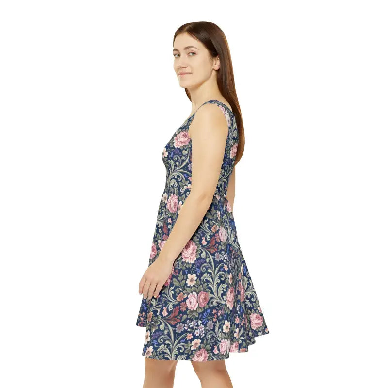 Picture yourself in this gorgeous navy tapestry masterpiece where delicate vintage vines dance across rich fabric in a captivating all-over print. The classic fit-and-flare silhouette creates that perfect feminine shape while soft stretch fabric moves effortlessly with your body. A flattering scoop neckline beautifully frames your collarbone while the flowing skater skirt adds playful charm to garden parties, weekend brunches, or romantic evening strolls.
