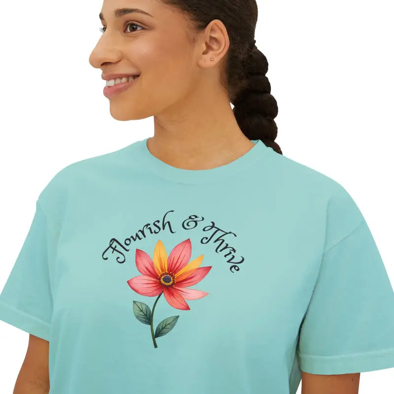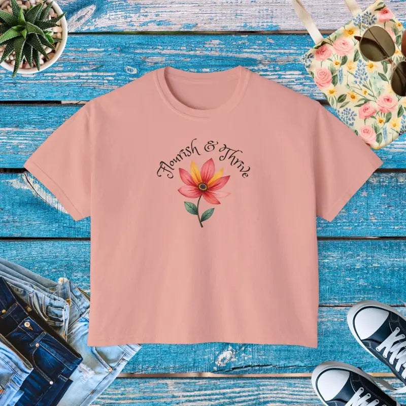 This floral graphic boxy tee truly delivers a perfect blend of style, comfort, and durability. With its unique design and quality ring-spun cotton construction, you are sure to turn heads wherever you go. Grab yours now and let every outing be a statement of self-expression done right with a boxy tee that emphasizes ease, quality, and low heat care for lasting beauty.