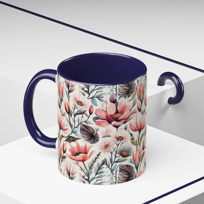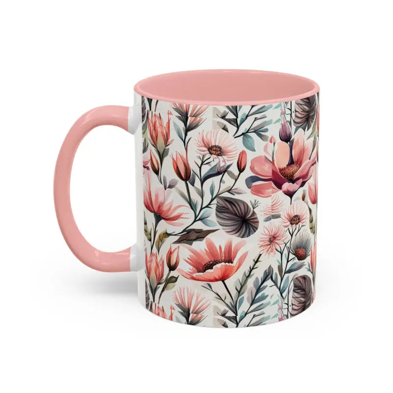 Flowers and birds, Accent Coffee Mug, 11oz. Add some color to your routine with this two-tone, accent coffee mug. This 11oz mug features an accented C-Handle that is comfortable to use, as well as an accented interior to add more contrast and character.