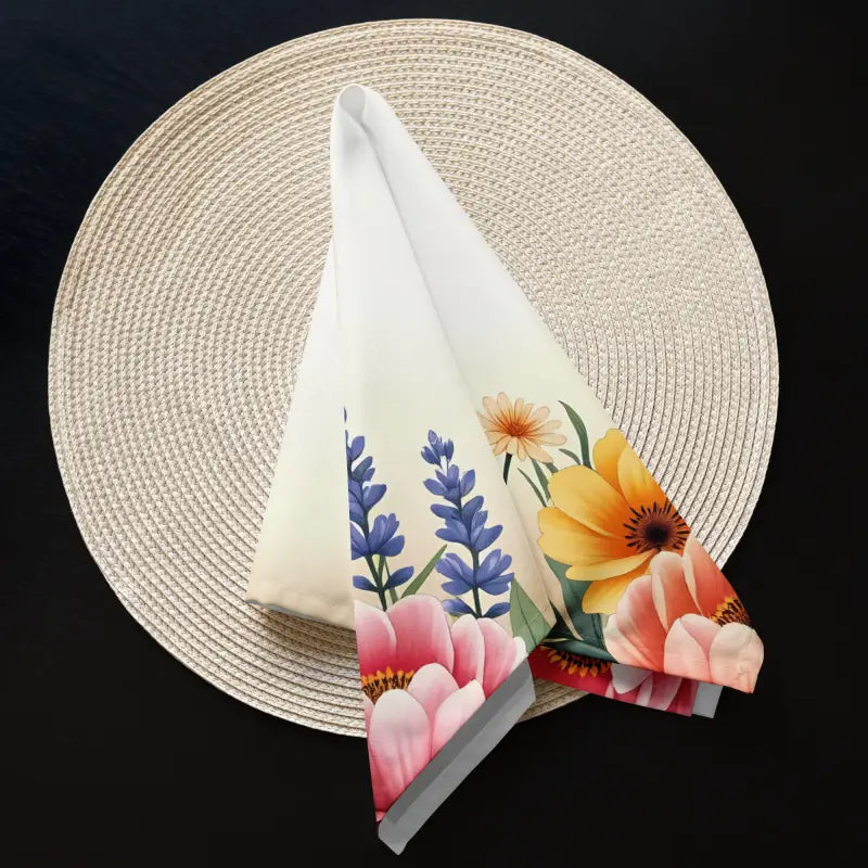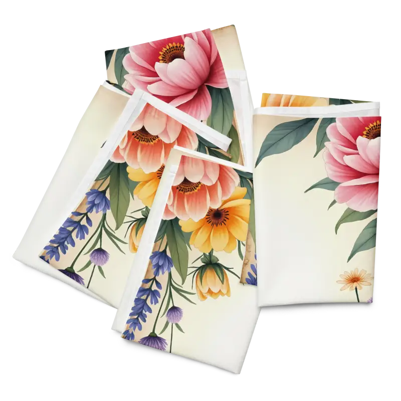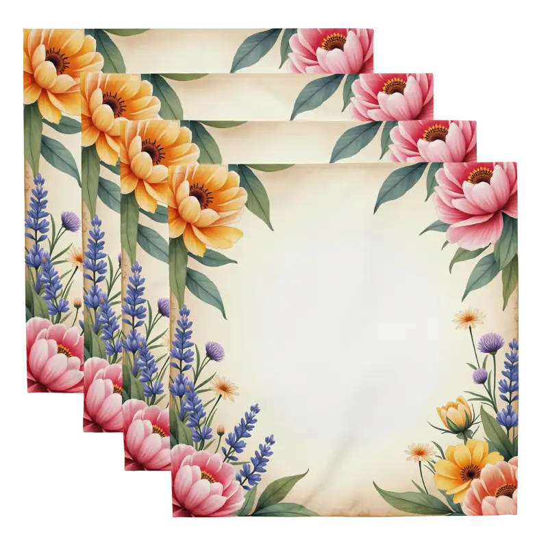 - Includes four uniquely designed napkins, each featuring flowers at all four corners