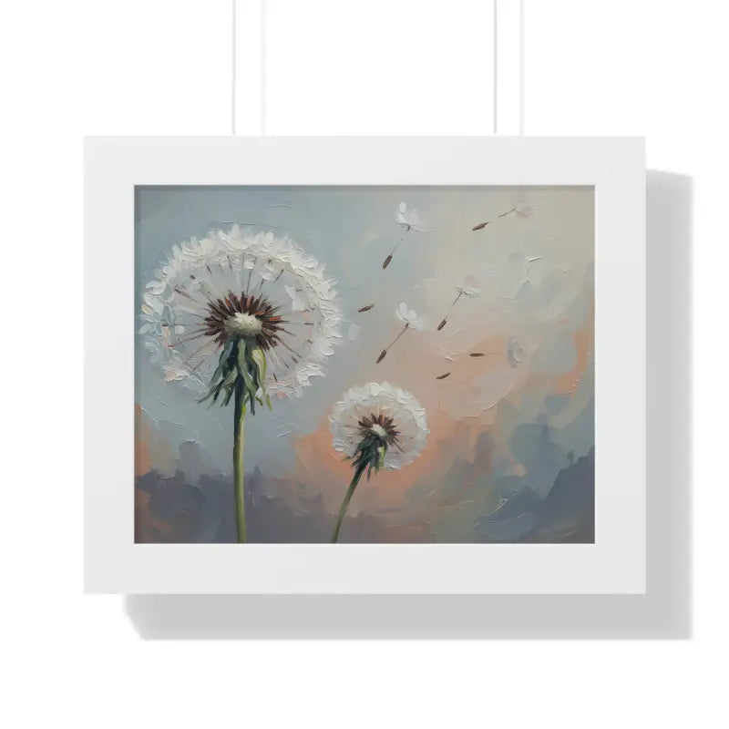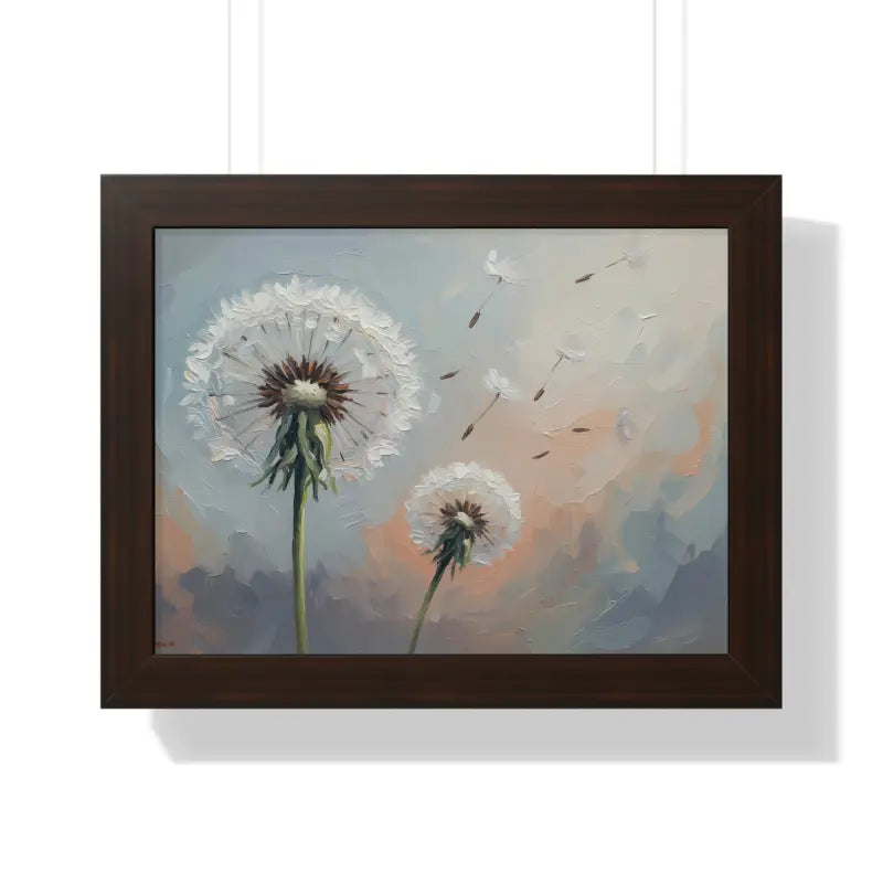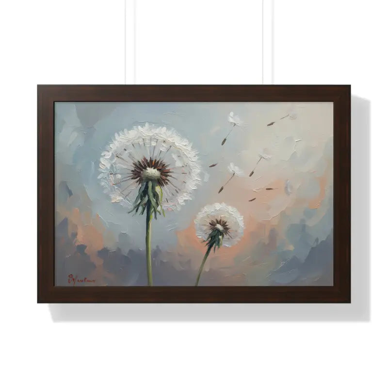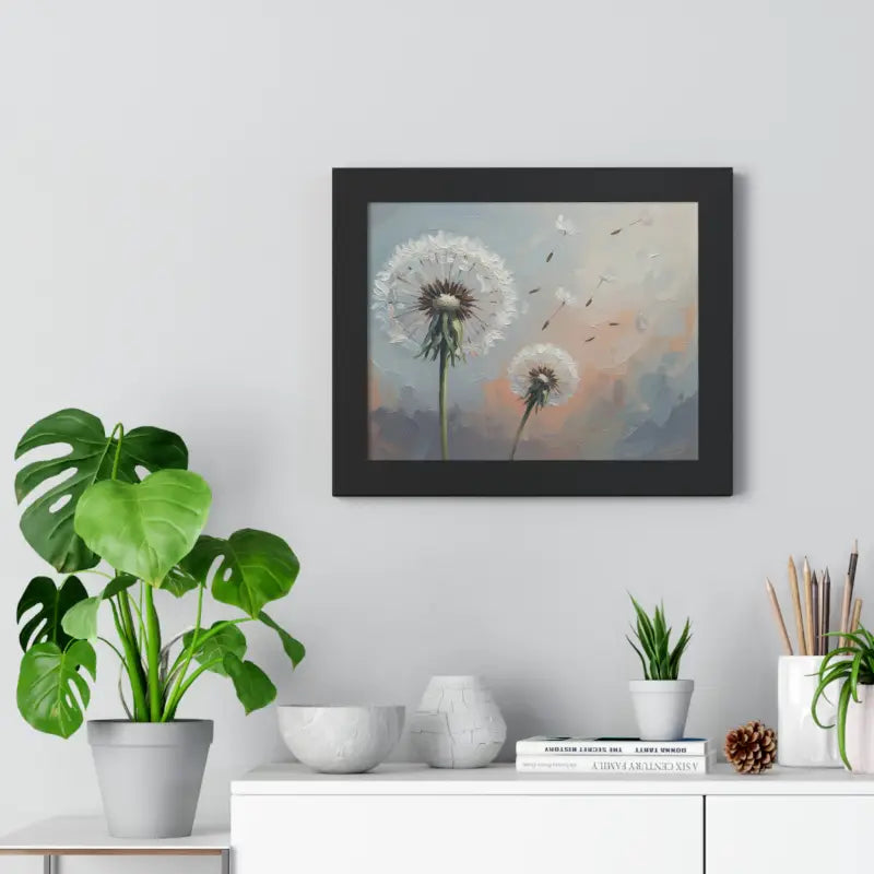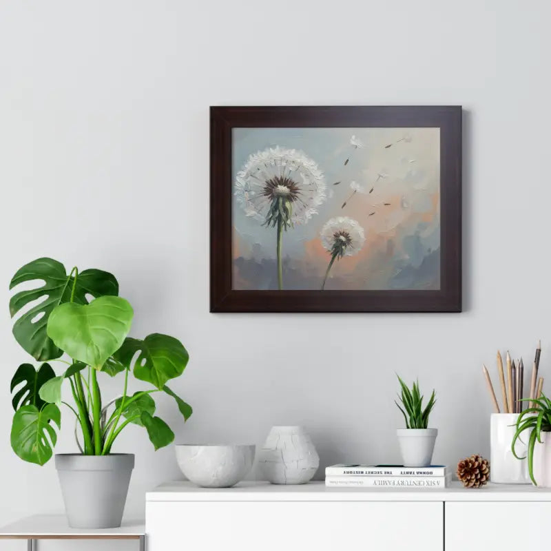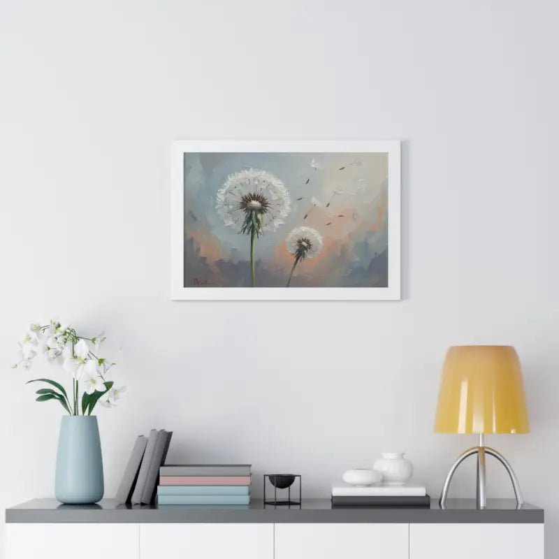 Soft sunlight filters through your space as the Framed Dandelion Wall Art adds a dreamy calm to your day. This horizontal floral print captures weightless dandelion seeds drifting across pastel skies, turning any wall into a moment of quiet beauty.